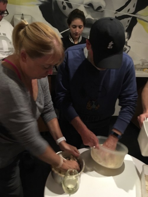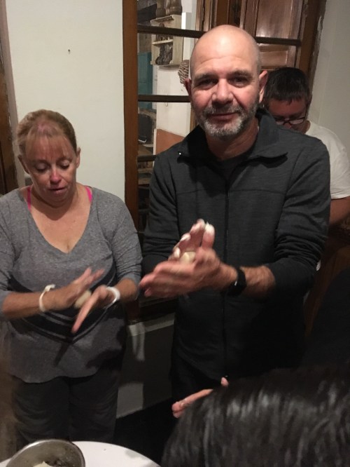 We booked into a cooking school at the Masaya Hostel run by Mario the night manager. The lesson was making arepas. Its a corn bread with a very simple recipe – corn flour, salt, water and oil. We tried these at a restaurant in Brisbane and they were a bit nothing. These were amazing and they are served as a side dish – Mario gave us some great serving ideas. Jayenne and Stu got the opportunity to mix and i rolled them into balls and patted them flat.