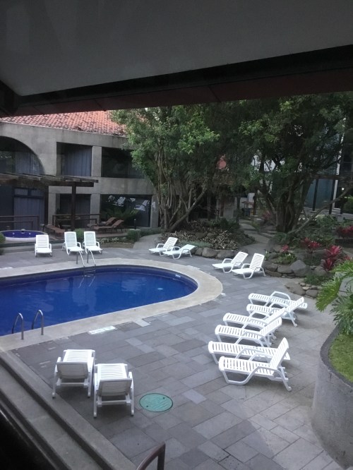 We are transiting to San Jose today. As we are going west we gain an hour. We were up early this morning to get to Santa Marta airport for our flight to Bogota the on to San Jose. We shared our bus with Claire, Becky and Roseanna. We had a pretty uneventful couple of flights (we upgraded to business Bogota to San Jose) to San Jose. The city is a different environment to Bogota. We are staying at the Radisson which has beautiful grounds and hot water – we have now had two hot showers after almost 2 weeks of no hot water.