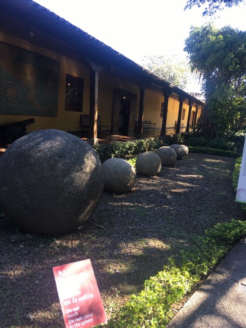 We then piled on the bus and headed to the National Museum of Costa Rica which is housed in the old army barracks. There was a civil war after which the Government disbanded the army (Costa Rica does not have an army to this day). There are bullet holes on the outside of the barracks fired on the army by the President and his supporters. The museum is quite beautiful and even has a butterfly garden. The pre-columbian cultures here had no steel and no wheel yet they created almost perfect spheres.