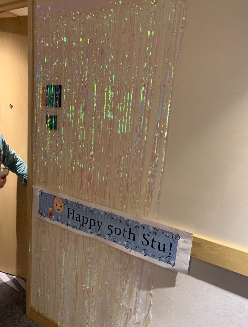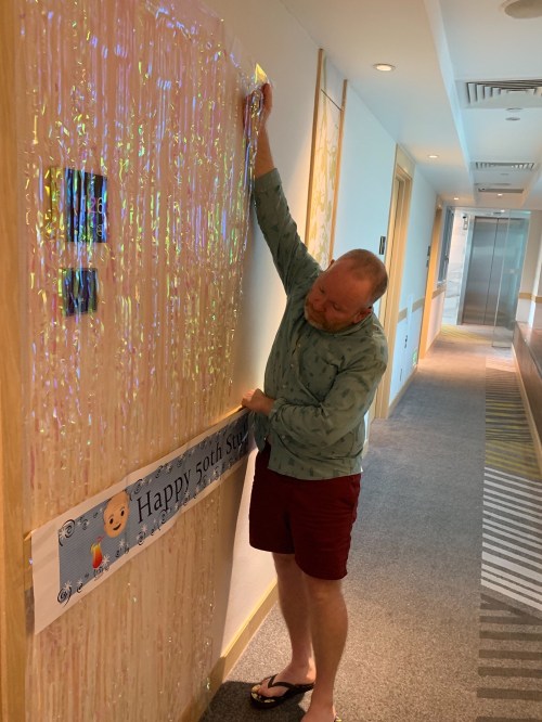 Today is Stu’s birthday. We started the day with a birthday banner from Stephanie and Gabrielle, and moved on to cake toppers and anything else that highlighted Stu was the birthday boy. Everyone did so well – thank you all for coming to Singapore for his “cough cough” birthday (I’m not allowed to put down 50th).