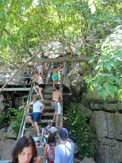 We had 45 minutes at this site then we were off again. The boat was heading to an island (I didn’t write any of the names down) where you can climb up to a look out, then down to a lagoon. This was a really difficult experience with the crowds and almost vertical stairways. Going up was fine but coming down took ages. We were supposed to only have an hour here but we ended up being there almost 2 hours as we think the boat was broken and the crew was trying to fix the engines. The docks at the islands where we alight are made of plastic canisters that you walk across to get to the shore.