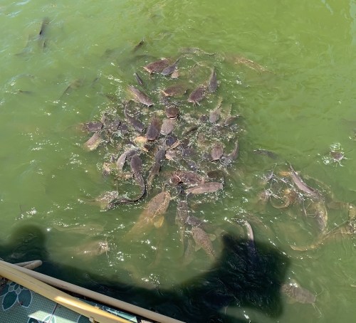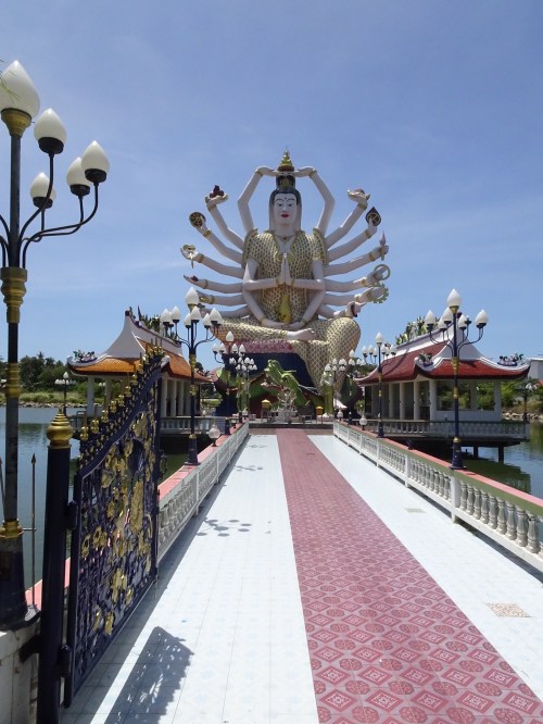 After Big Buddha and a bit of shopping we went to a temple called Wat Plai Laem. This has 4 different temple complexes and what I think was a buddhist school attached to it. I paid 10B for fish food to feed the biggest cat fish you have ever seen living in the lake. At least here was quieter than the big Buddha.