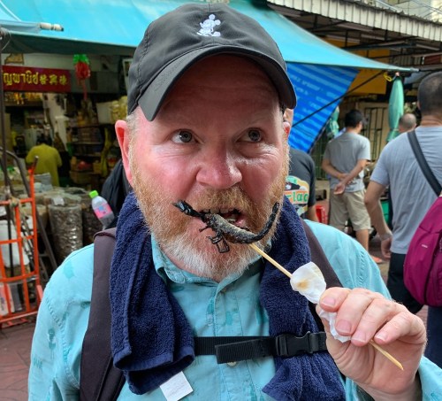 We had a great time on the tour it was like 4 old friends catching up P and Ta were so friendly. I would recommend this tour to anyone coming to Bangkok. It is about 3 hours of walking but you won’t notice the time go by. We tried so much food that we won’t need dinner tonight. We walked through several markets and a couple of old style malls. We visited Little India and ended in Chinatown (Stu is making me go back there as you can buy everything there) and went to the Chinese History Museum. The end of the tour is when Stu tried scorpion. P and Ta even escorted us back down the river to where our shuttle boat could pick us up. What an amazing day and so much food it is hard to write it all down. We even went to Jek Pui Curry from the Netflix show Asian Street Food.