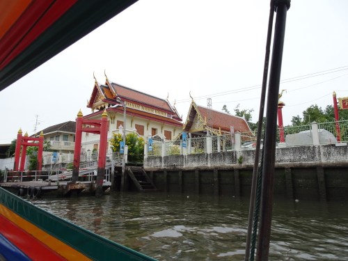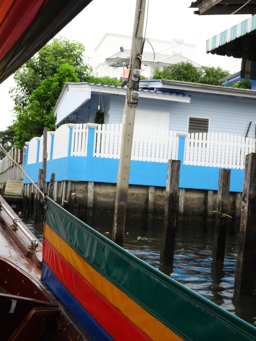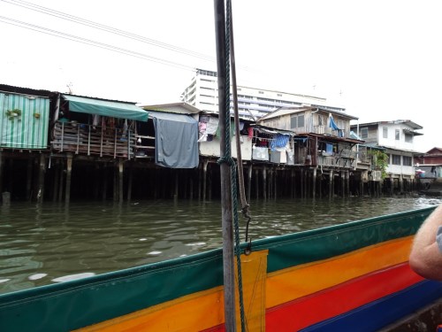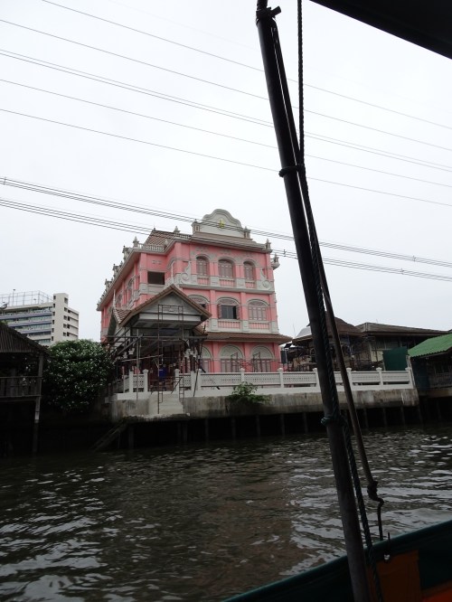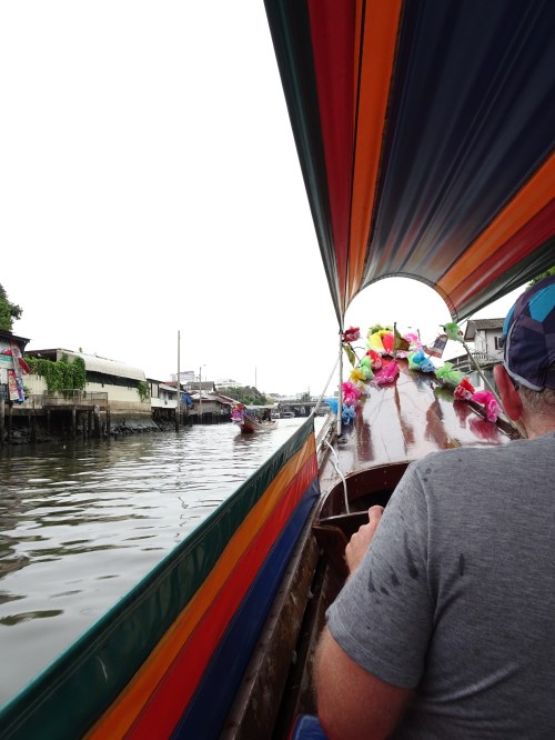 We hired a long tail boat to take us around the canals for an hour today. It’s been rainy all morning so we bit the bullet and got the driver to come at about 11 and just hoped it stayed pretty light while we were out. The canals are a contrast there are temples, houses on stilts some falling down and others still looking pretty strong and then there are the new apartment blocks and mansions. As part of the tour we were approached by a hawker in a boat – she didn’t put up much of a fight when we said no. Some pictures are below.