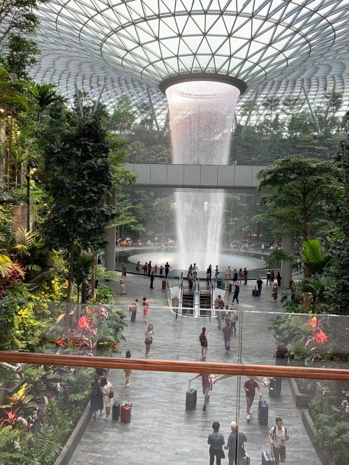 Today (Monday) we went to Orchard Rd (all high end) and just wandered. We felt Bugis calling us so we hopped the MRT back to Bugis for a final explore and lunch (we may have had to buy a $30 suitcase to get everything home). Before we cleared immigration we had a quick look at the Jewel the new shopping centre with an indoor waterfall and garden. We are chilling with some G&Ts in the club.