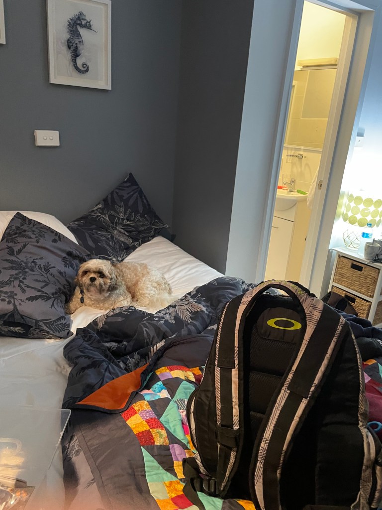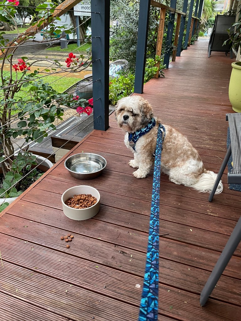 Day 1 we were aiming for Port Macquarie and had booked a dog friendly room at the Narimba Motel which is on the Hasting River – needless to say everything was very muddy and wet but the owners were very understanding. The room was small but comfortable.