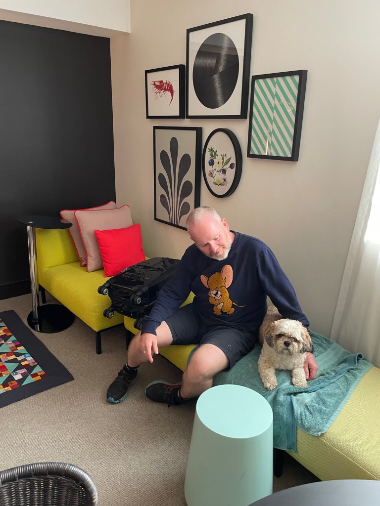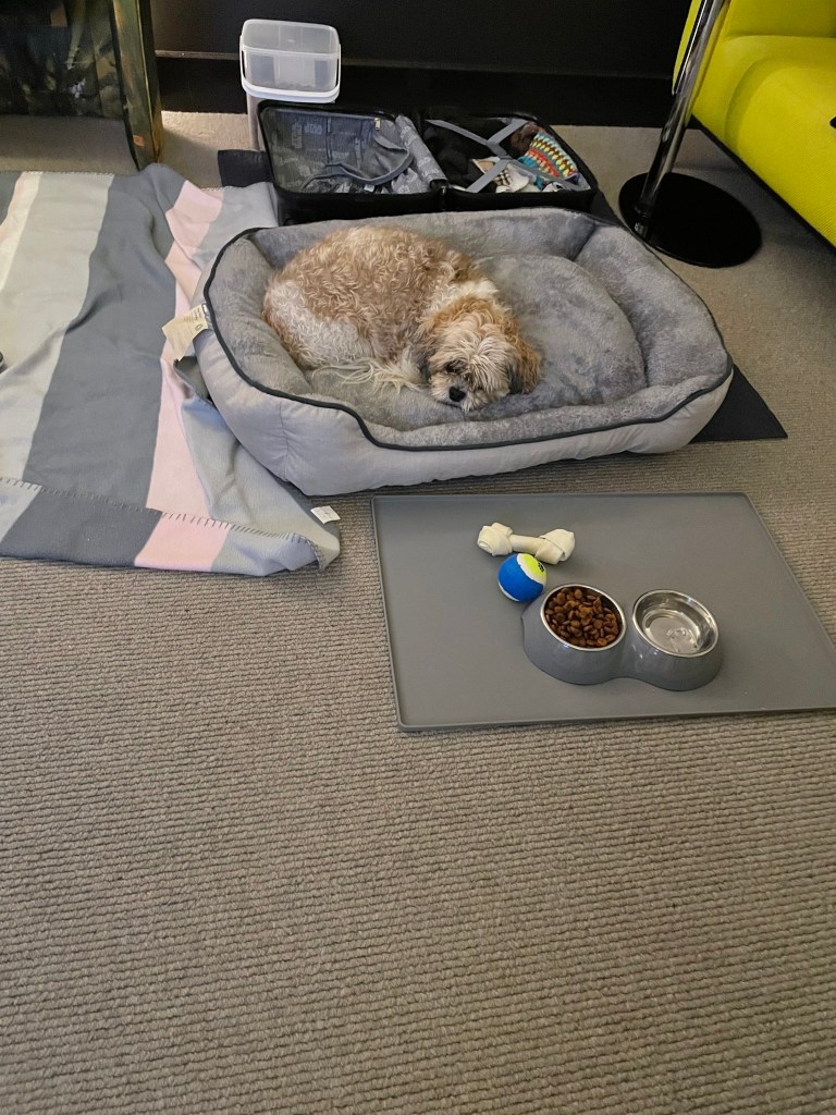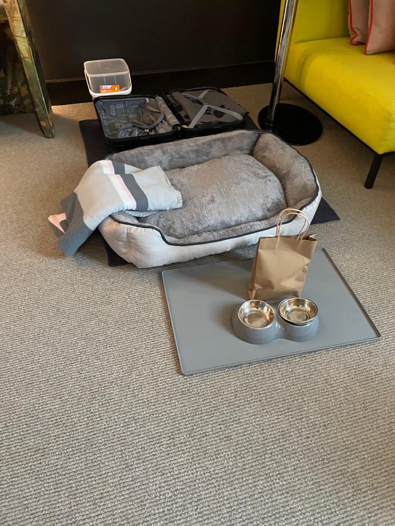 By the time we got back to the hotel Eric was very dirty and tired – We walk about 6km so we gave him a shower (he now won’t enter the bathroom) . When we got back they had set the room up for Eric – our original room wasn’t going to be ready in time so they moved us to a different room. There was a dog bed, blanket, bowl and a little gift bag for him. We’ve decided to settle in for the night – we will probably eat somewhere around the hotel.