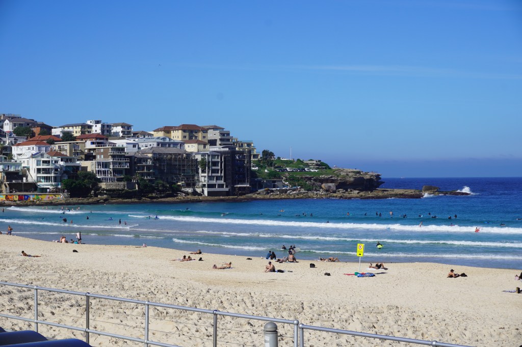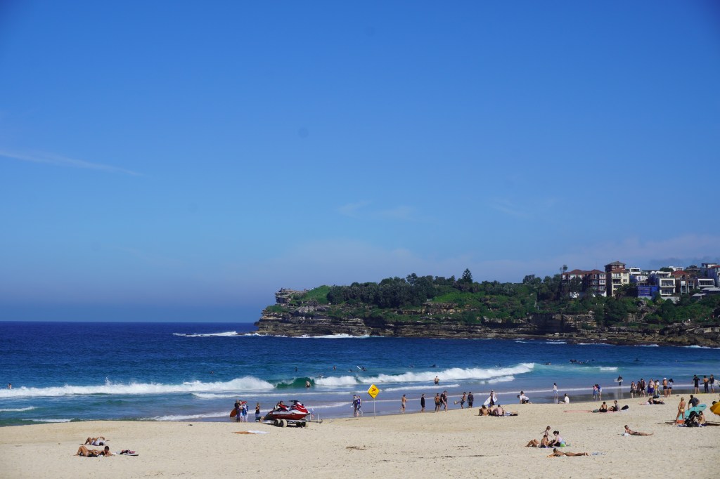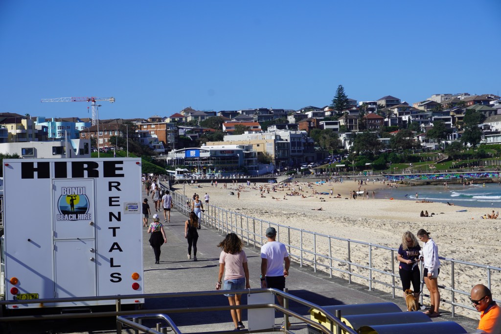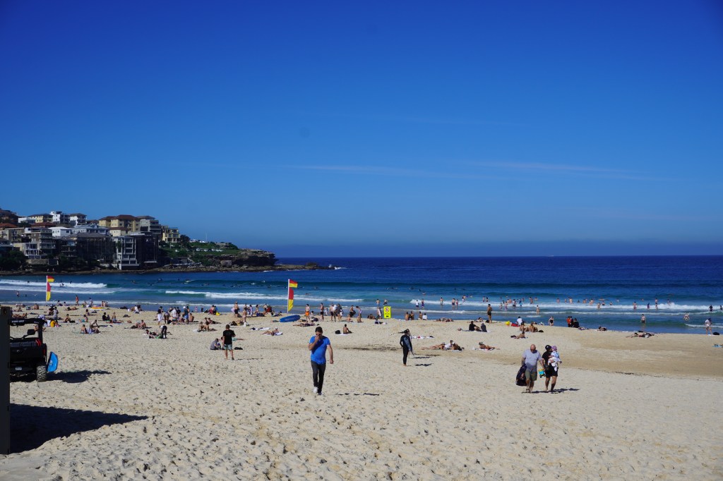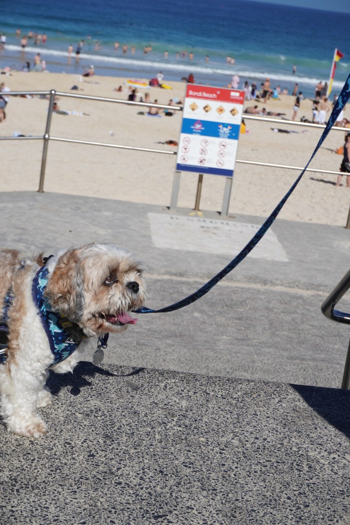 We originally couldn’t find a park but as we set the navigation system for Surry Hills we went back along the beach and there was plenty of parking. Even though we had promised Eric no more walking we were off again. We crossed the road to the Farmers Market only to find that dogs are banned from NSW schools (it’s not an opinion, it’s the law the sign said). So the beach it was – we started about half way up the beach and walked down towards the South end – where we came up at Bondi Ink (reality TV watchers will understand) then walked back towards the car and had lunch at a great dumpling place.