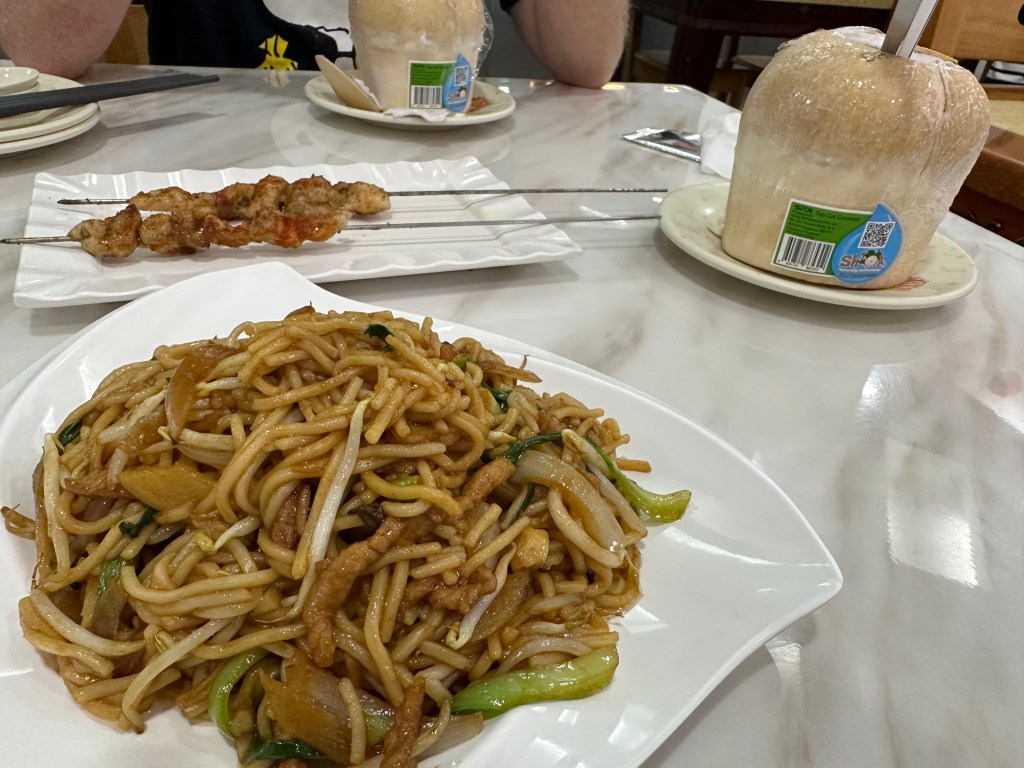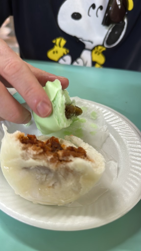 We have eaten “local style” today. The Parkroyal breakfast is $40++ per person, we ended up paying about $15 total for our breakfast. I had BBQ pork buns and Stu had spicy noodles with meat balls. We also tried a pandan pao which was really nice.
