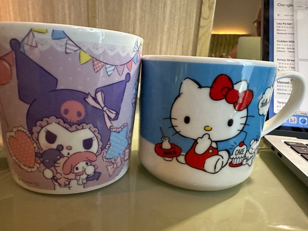 We purchased a few things including an insulated water bottle each, personal fans and a couple of cute mugs.  The mugs in the hotel room are too big to use the coffee bags/filters in.  Yes they are Hello Kitty and My Melody – Peter Schrader will get the joke, even if we didn’t buy him a mug .