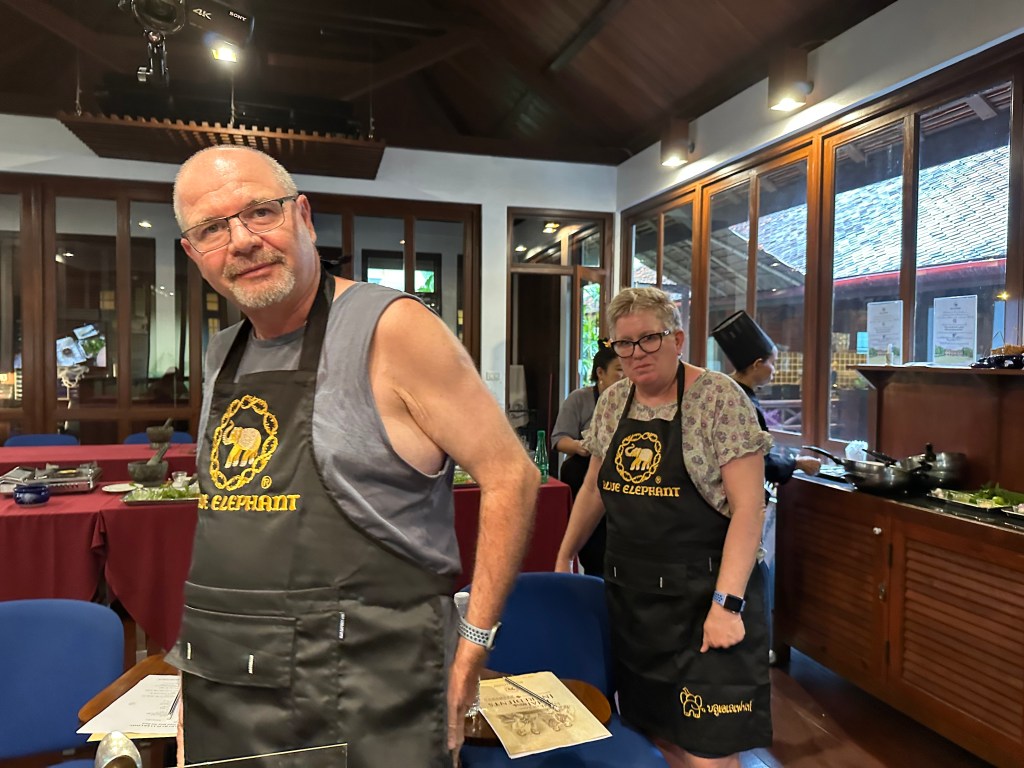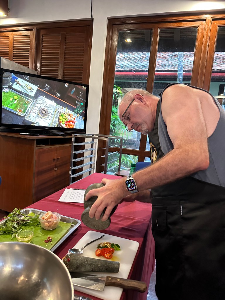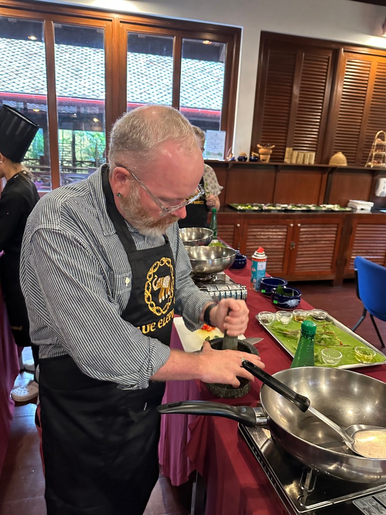 I had thought the tour included a pick up and by about 1:40 was starting to get worried. As it turned out it didn’t include a transfer – when I checked the voucher it said pick up time 1:30, pick up location Blue Elephant. After numerous phone conversations we managed to get a taxi out to the Blue Elephant. We got there about 2:40 (an hour after it shoud have started). The chef was very accommodating and we started the class. The one advantage to being late was that the kitchen staff did all of the chopping and pounding (mortar and pestle), so really all we had to do was cook.