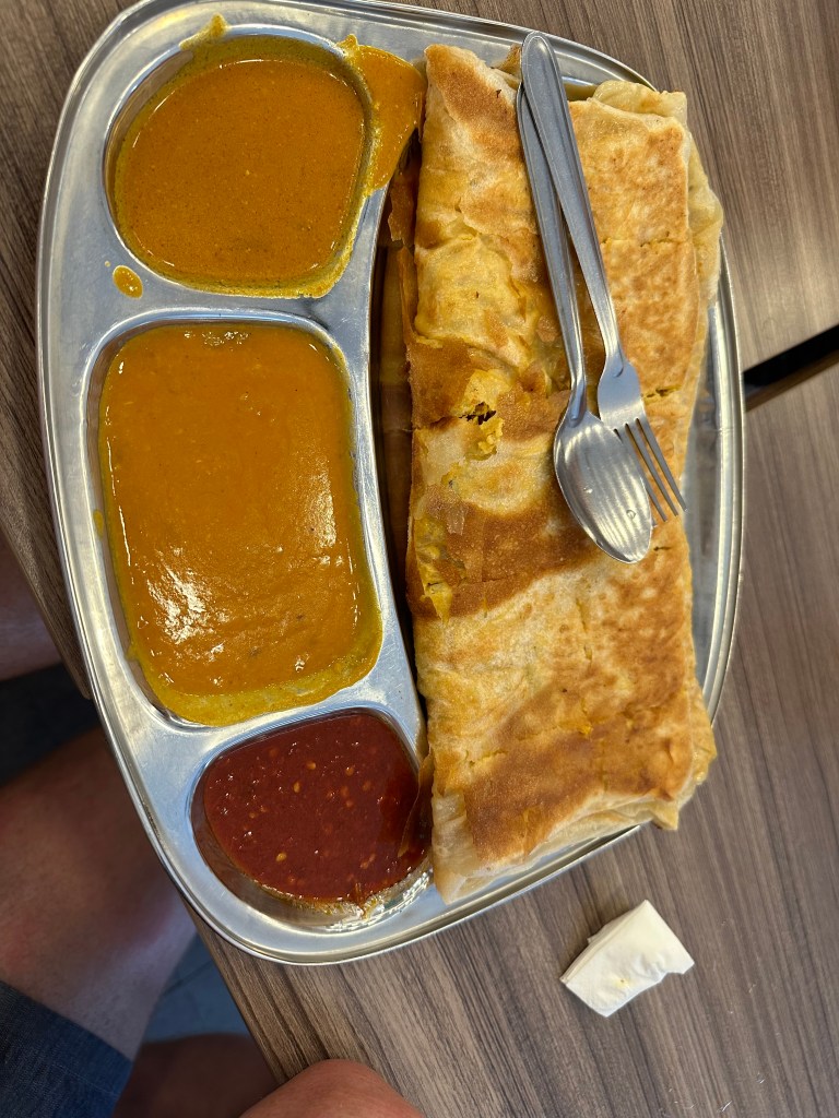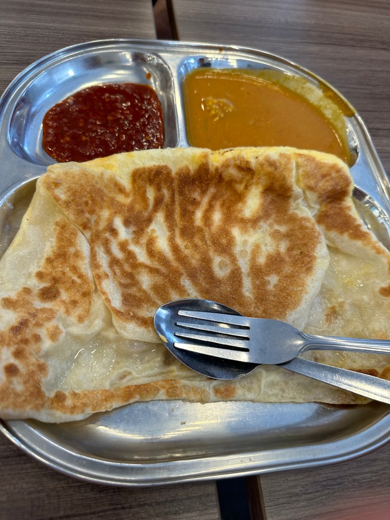 We started the morning with a hawker centre breakfast – Stu and I picked a couple of breads with egg in them and curry sauce. The food was very delicious.