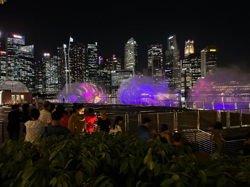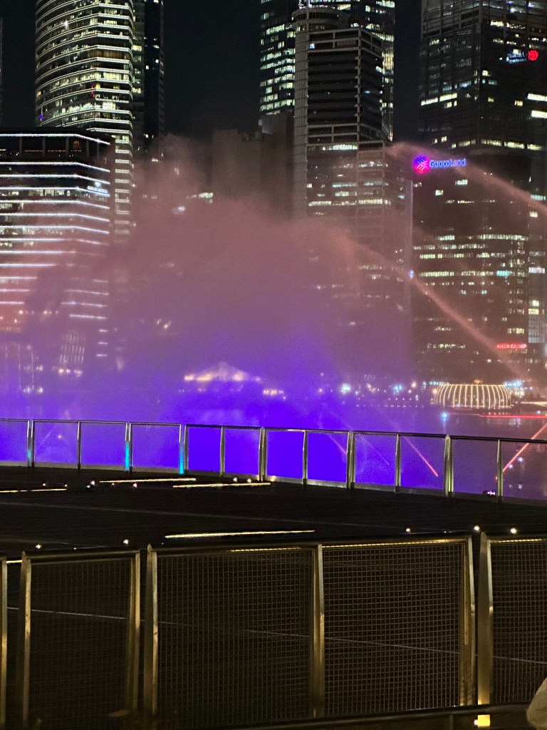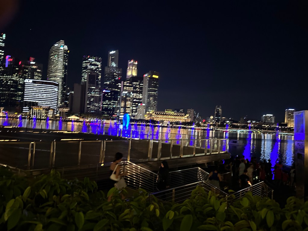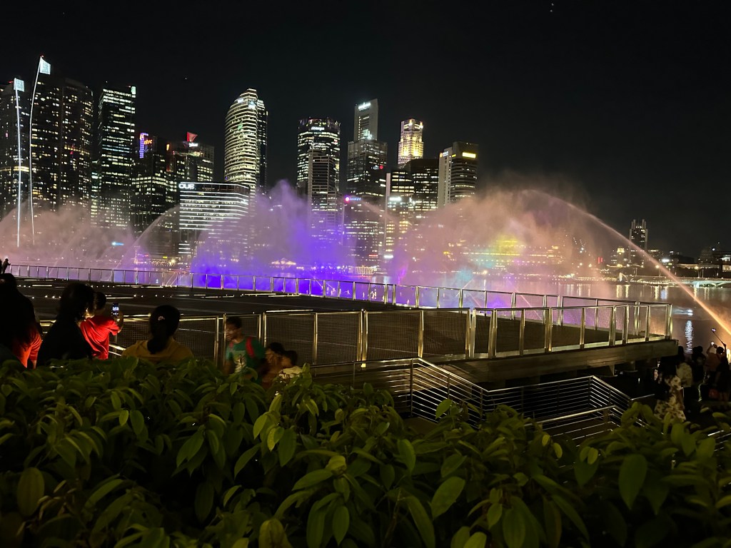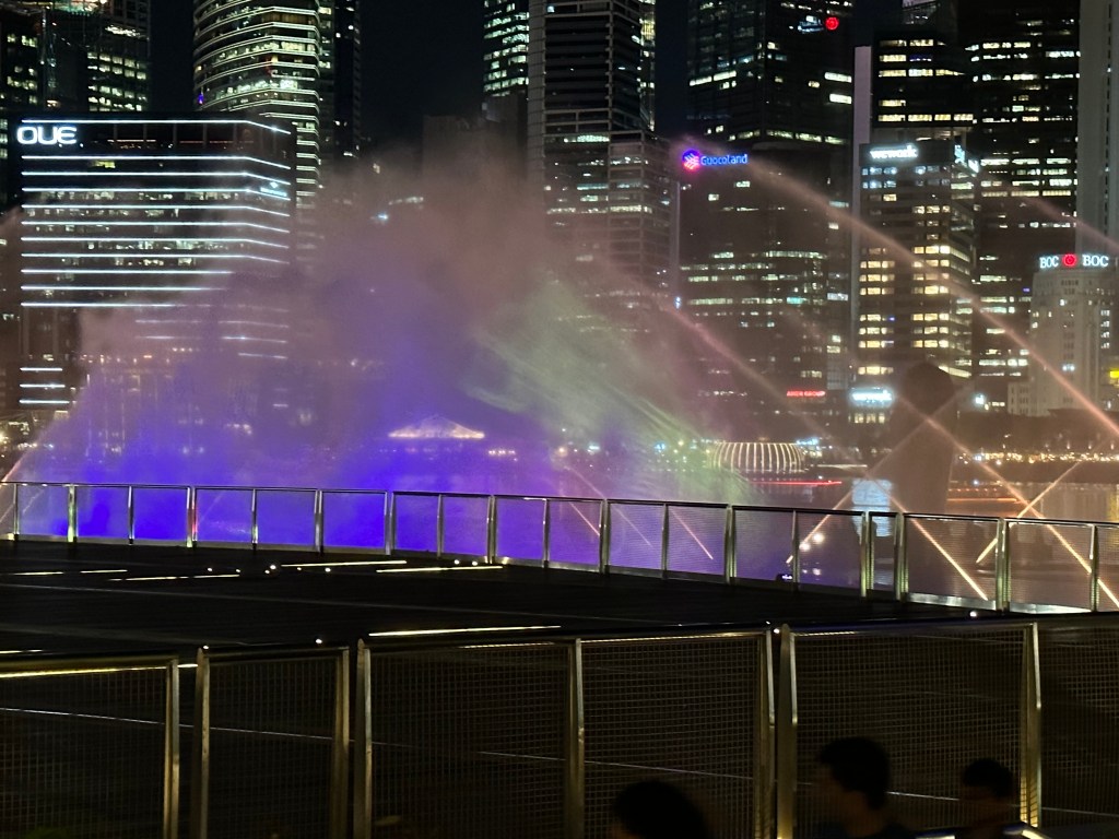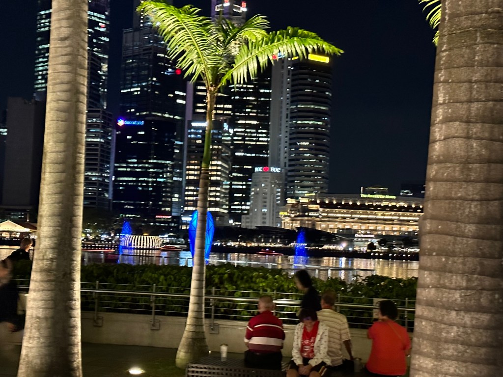 After the domes, Stu and I were a bit pooped and decided to go back and join Jayenne and Peter at Marina Bay Sands. The others did the skywalk and stayed for the light show. Stu and I went to Le Noir and had cocktails while the sun set. They had a live band for a little while who asked if it was anyone’s birthday – we said it was Stu’s (to make up for 2019) so they sung him Happy Birthday. We stayed for the Marina Bay Sands lightshow at 8 then headed back to the hotel very exhausted.