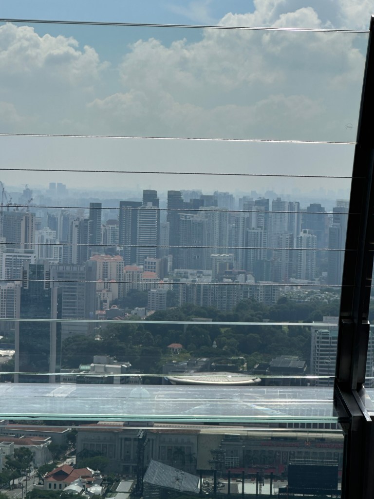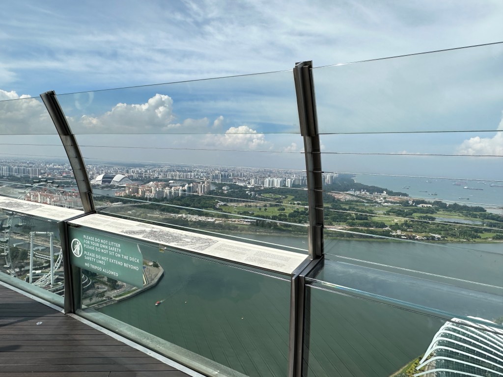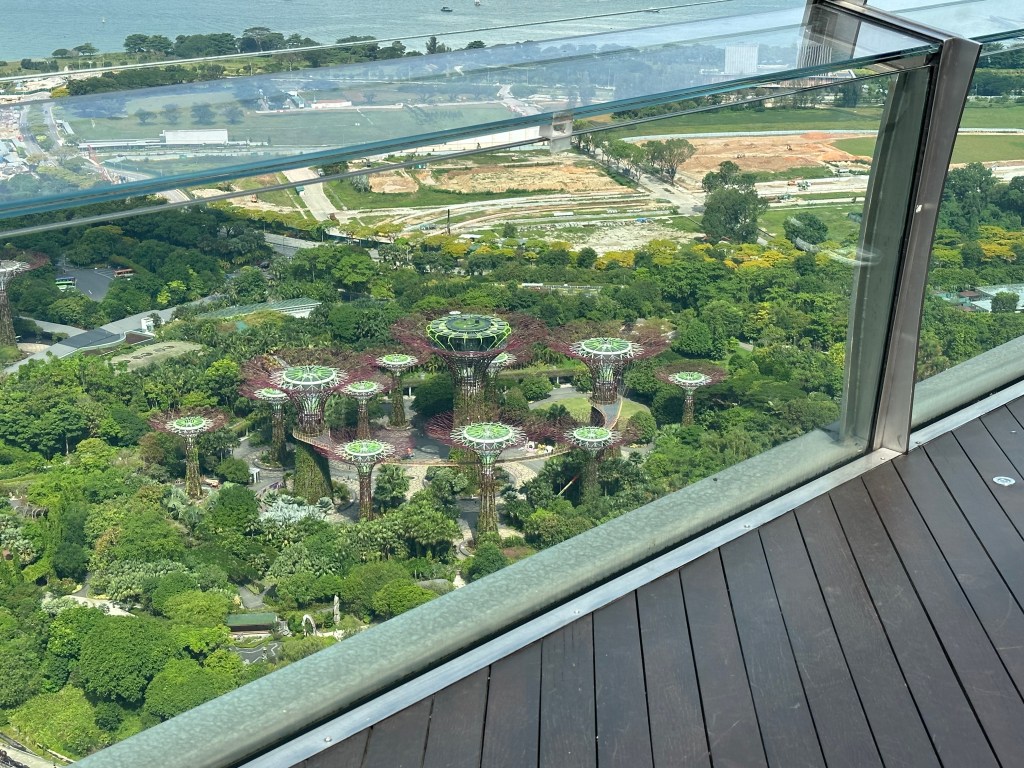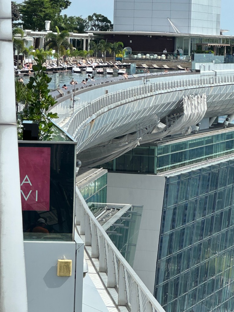 We whisked up to the 55th or 56th floor where you get access to the walkway around Marina Bay Sands. The view is spectacular however, the part non-staying guests get to access is only about 100m around the northern end of the hotel and there is no shade, and you can’t even see the pool unless you go up to a viewing platform, lean out and then you can see the pool.