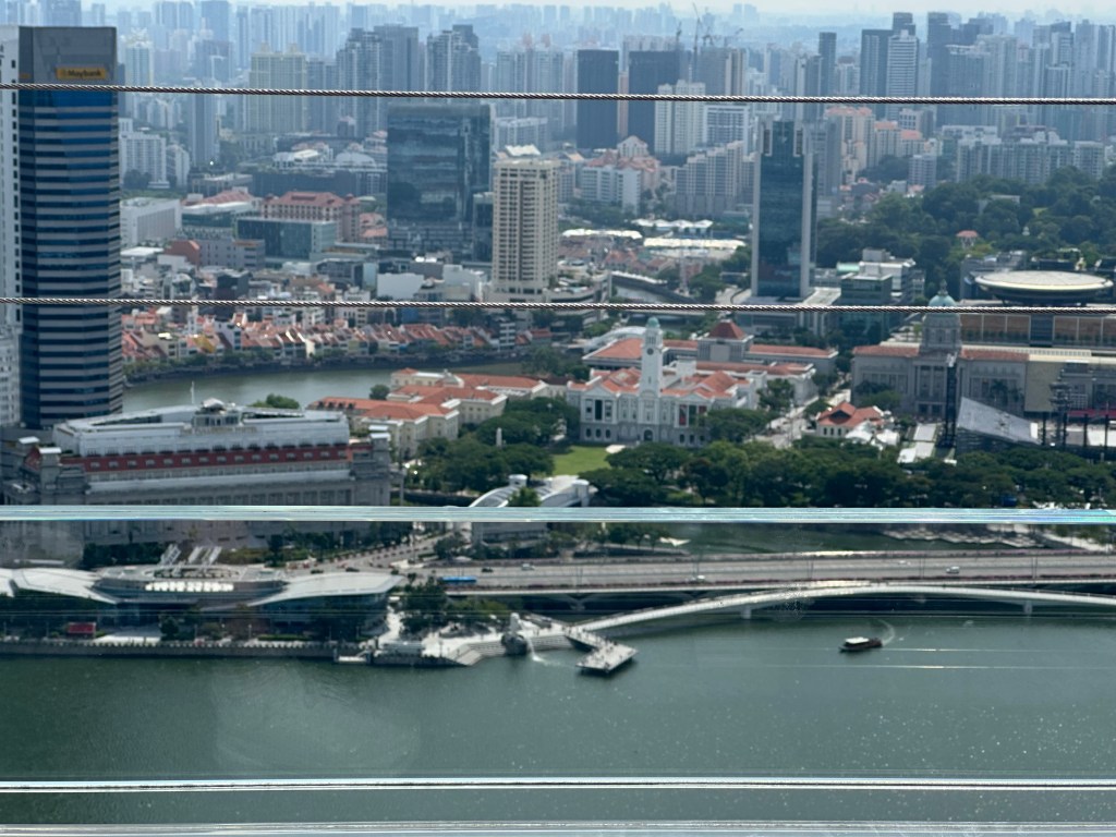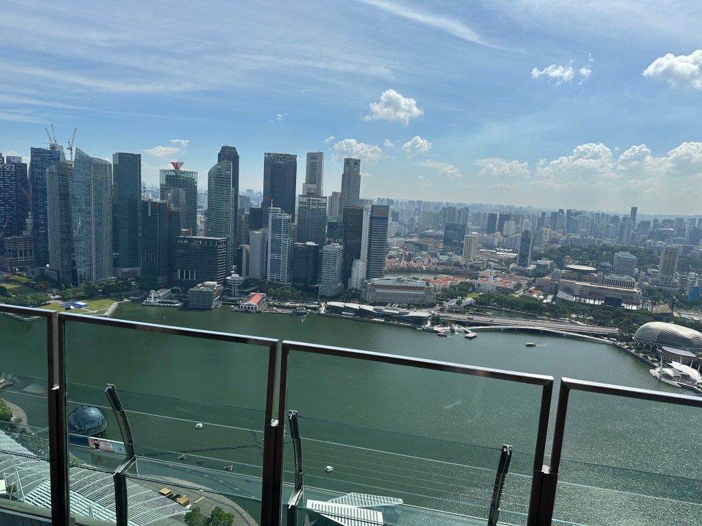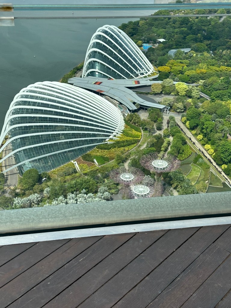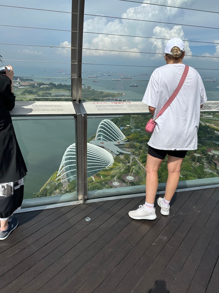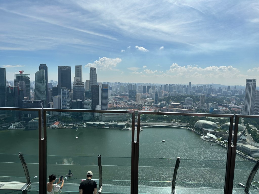 We whisked up to the 55th or 56th floor where you get access to the walkway around Marina Bay Sands. The view is spectacular however, the part non-staying guests get to access is only about 100m around the northern end of the hotel and there is no shade, and you can’t even see the pool unless you go up to a viewing platform, lean out and then you can see the pool.