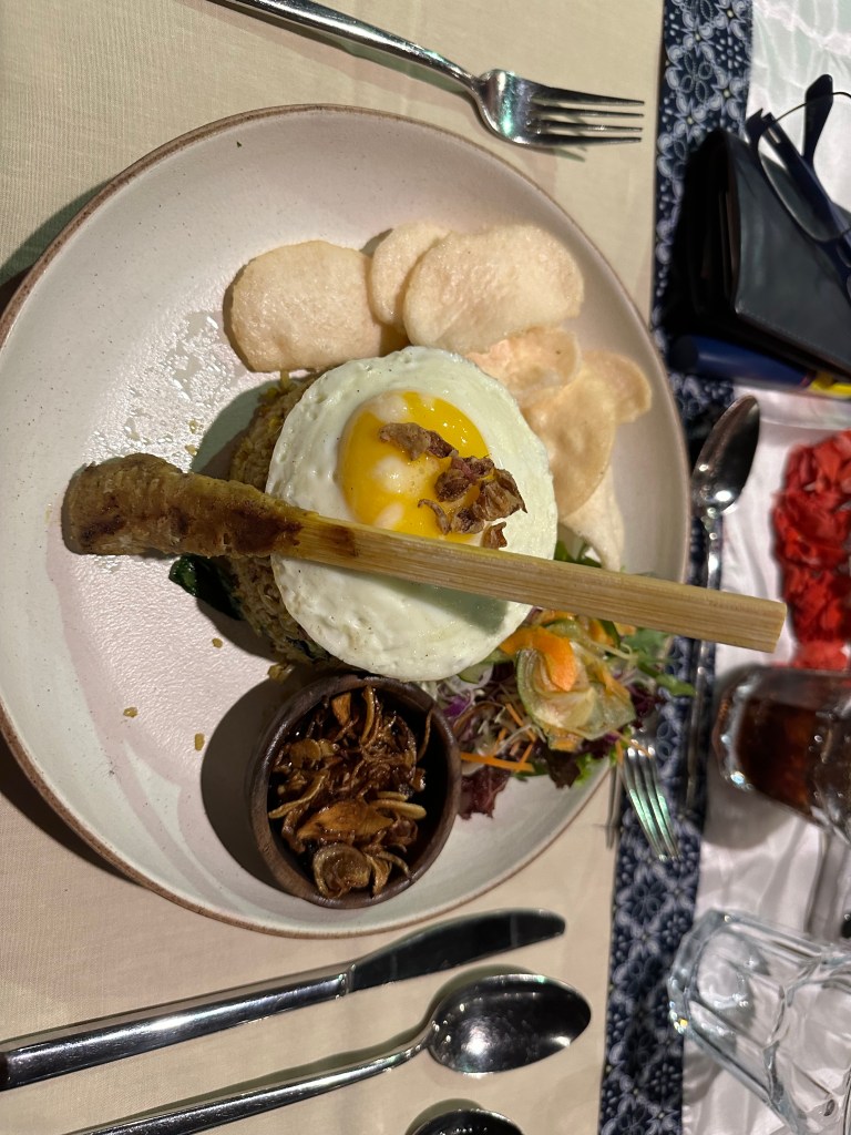 Our spa booking was 2 and at 12 we thought we had plenty of time to get some drinks and food before our massages. How wrong were we drinks took an hour (my banana milkshake took 10 minutes the rest took ages). At 1:20 we followed up on the ETA of our lunch and we were told we would be late for our massage. By 1:40 the Greek salad and a serve of spring rolls came, then the fried rice the the burger, so 5 of us shared three meals and cancelled the ones that hadn’t been made yet (I had hoped to try the Nasi Campur).