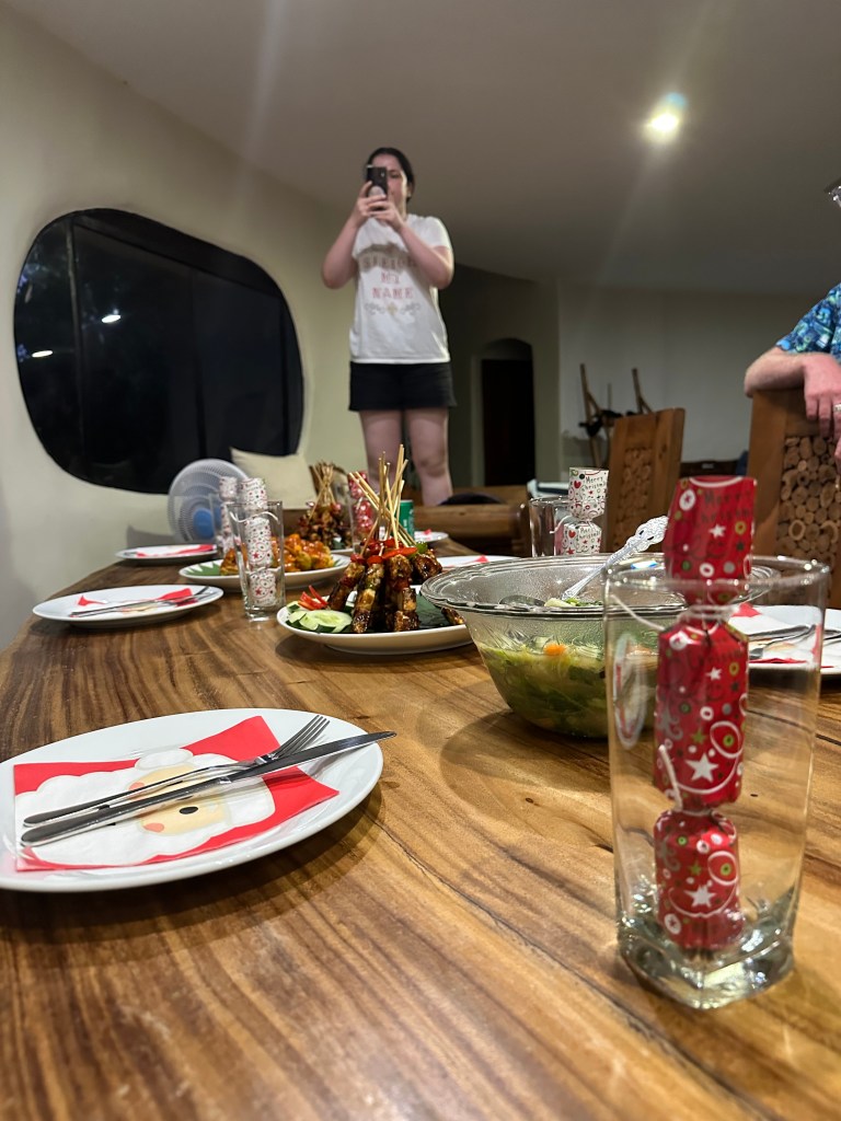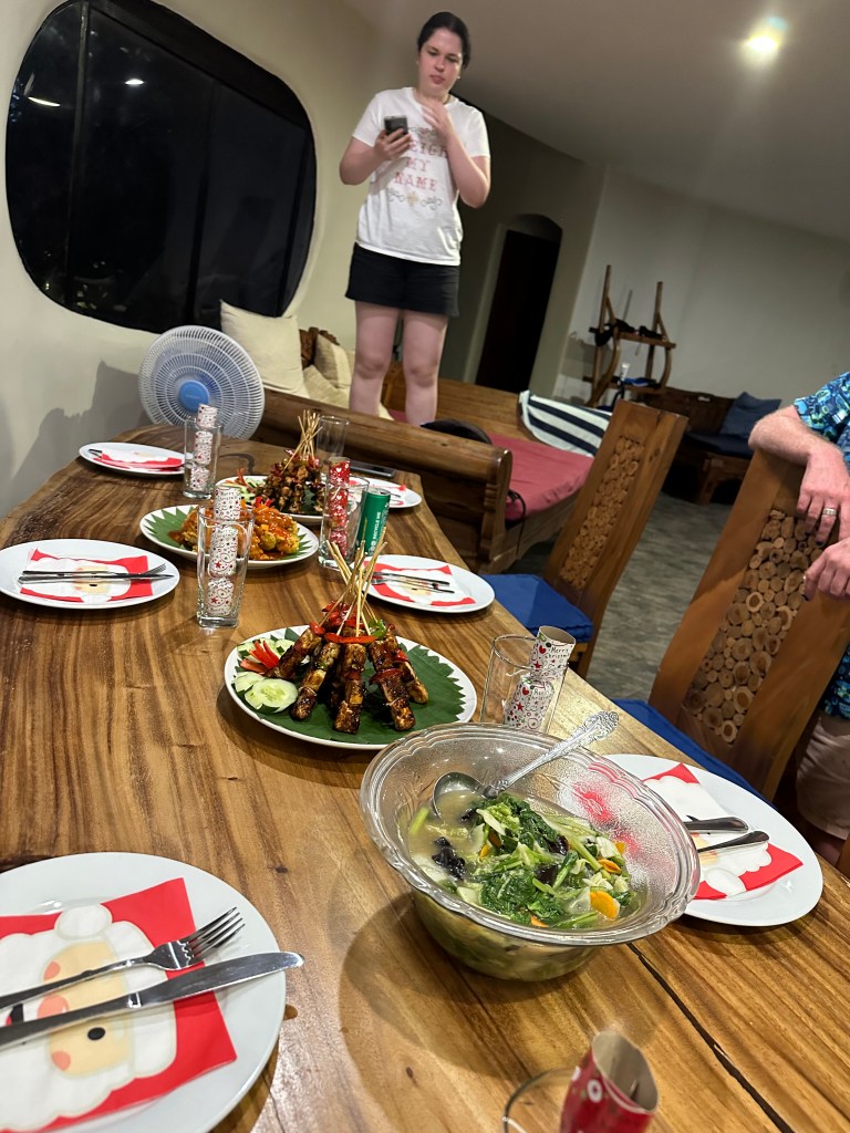 Christmas dinner was prepared by the villa and was really nice. We’d asked for Indonesian and we got Indonesian. We even got Pandan glutinous rice balls filled with sugar syrup which Stu and I liked but I’m not sure the Wise’s enjoyed (Stu called them Grinch’s balls which may not have helped). Gabrielle had “grabbed” a Black Forest cake for desert – it was $9 delivered.