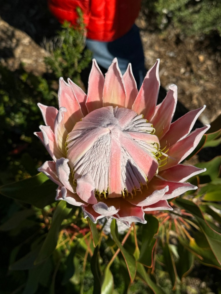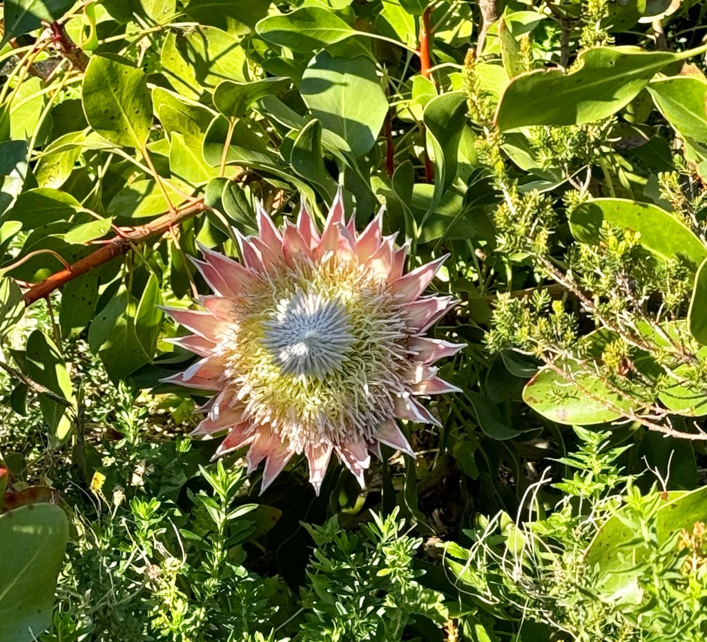 We saw a large number of plants including proteas, silver tree, medicinal plants, birds of paradise and cycads that are endemic to South Africa. One Cycad was more than 600 years old and was on the verge of extinction when they discovered it. Trees are one sex and use suckers to reproduce asexually. The botanists use the suckers to grow new plants and hope that one day one of them will be female (they are all male at the moment). They have to have it behind an enclosure as poachers used to come into the gardens at night and steal the suckers and there was a worry that the damage they were causing would kill the tree and make this Cycad go extinct.