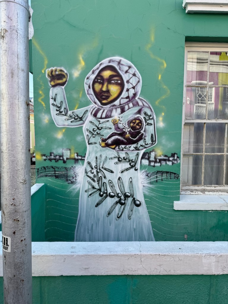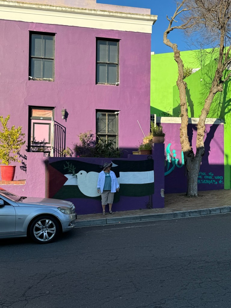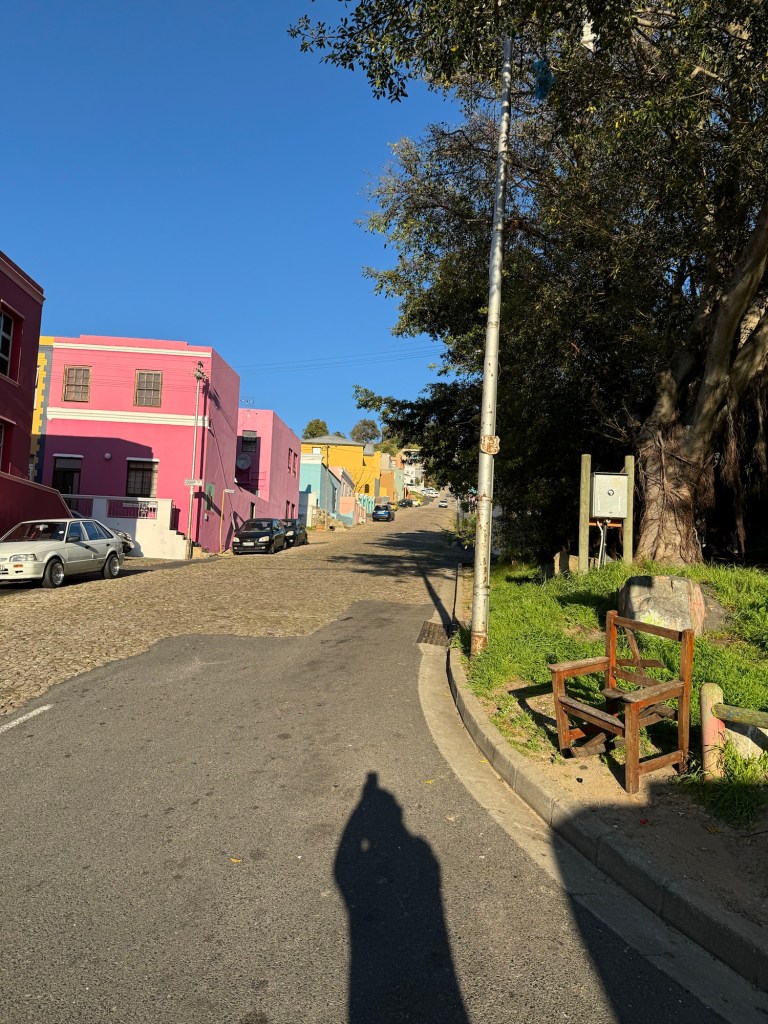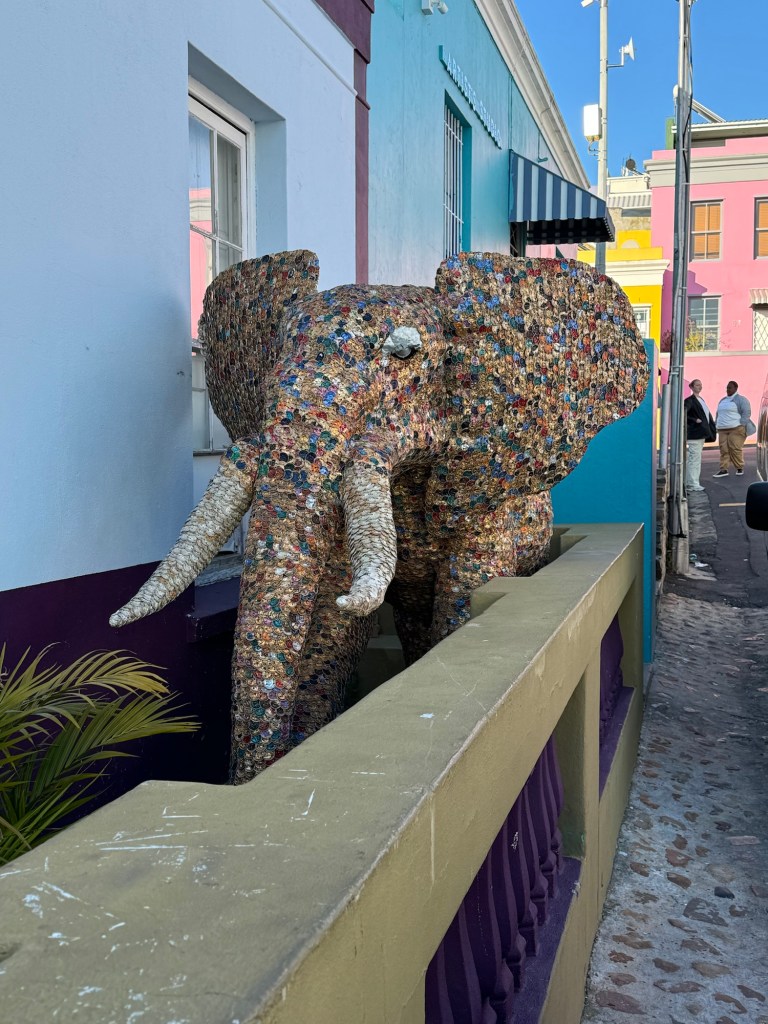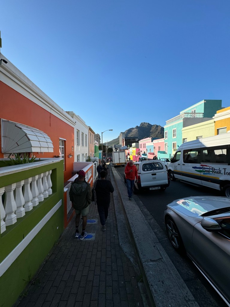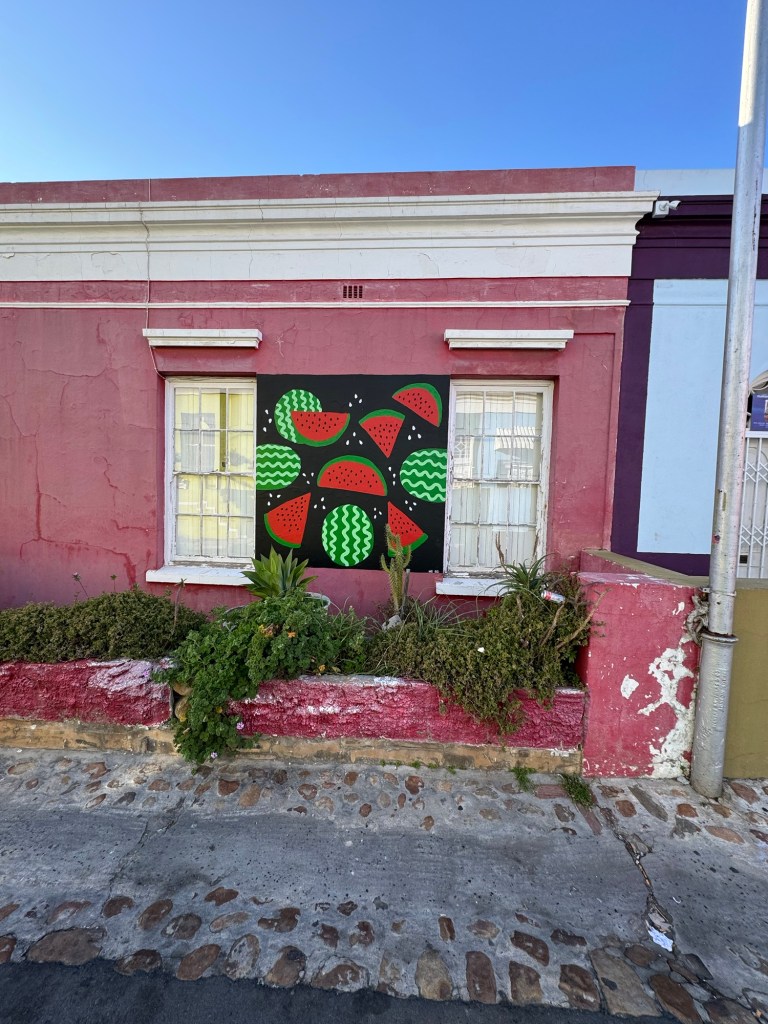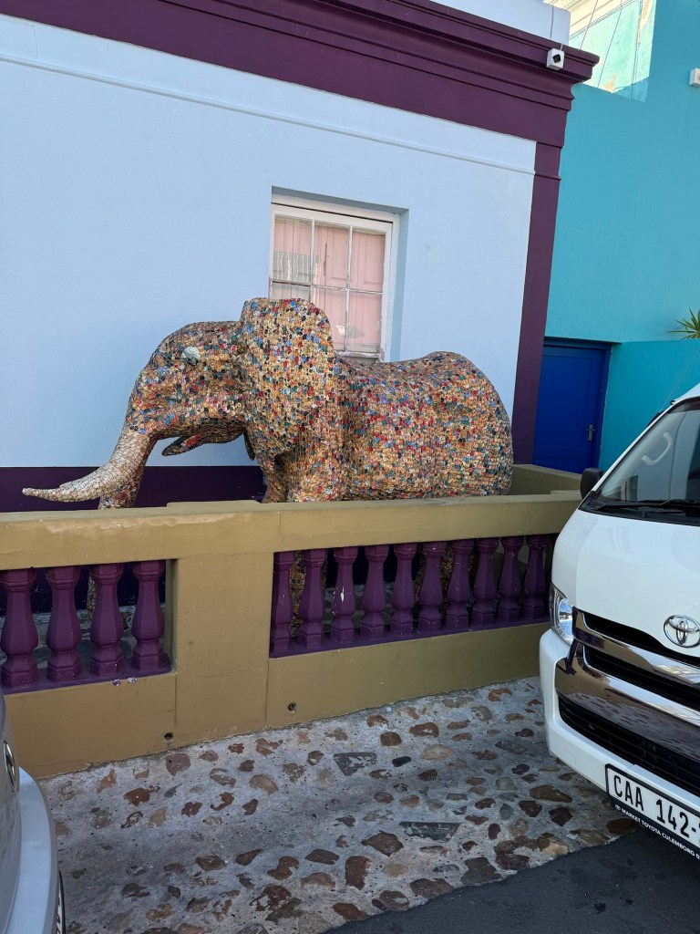 Today we left the hotel at 7:45 and won’t be back until at least 5:30 am. Our first stop is Bo Kapp in Cape Town which is known for its colourful houses and is the home to the Muslim area of Cape Town. The areas is made up of Malaysia and Indonesian immigrants who moved to this area to work for the people working and living in central Cape Town. We got to try Koeksisters which is like a gingerbread flavour (spiced dough) which is deep fried then boiled in a sugar syrup and rolled in coconut, very delicious. I didn’t find them to be too sweet but the others thought they were (I definitely have a sweet tooth). I thoroughly recommend trying them if you ever come across them. They are better hot but still delicious cold.