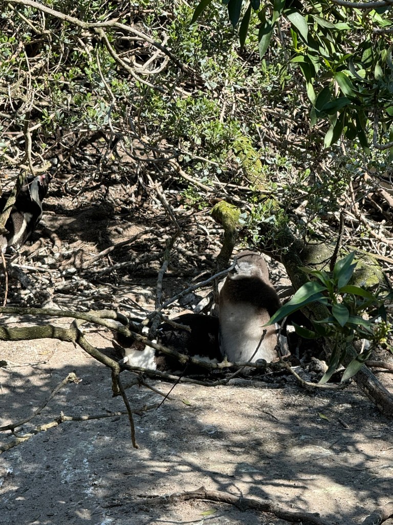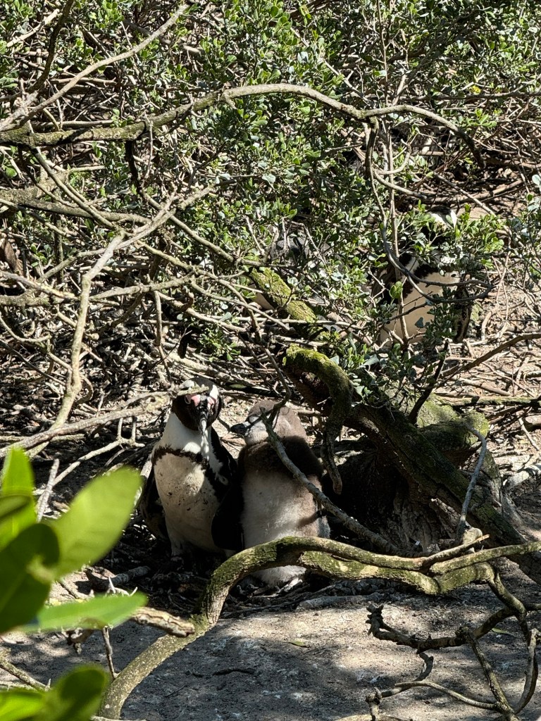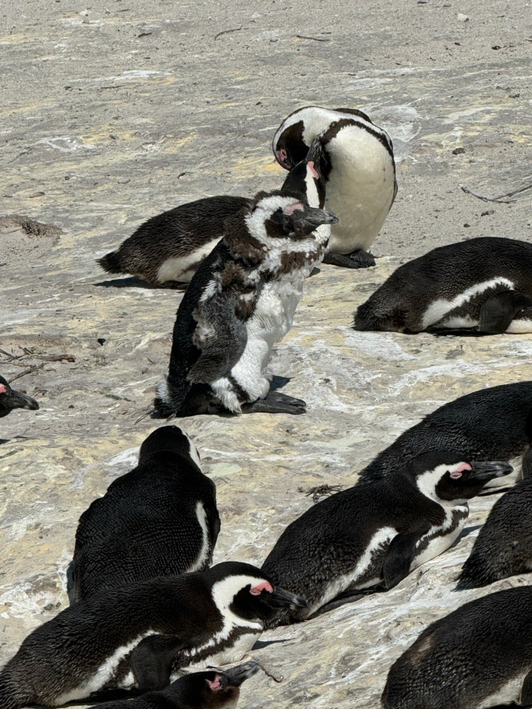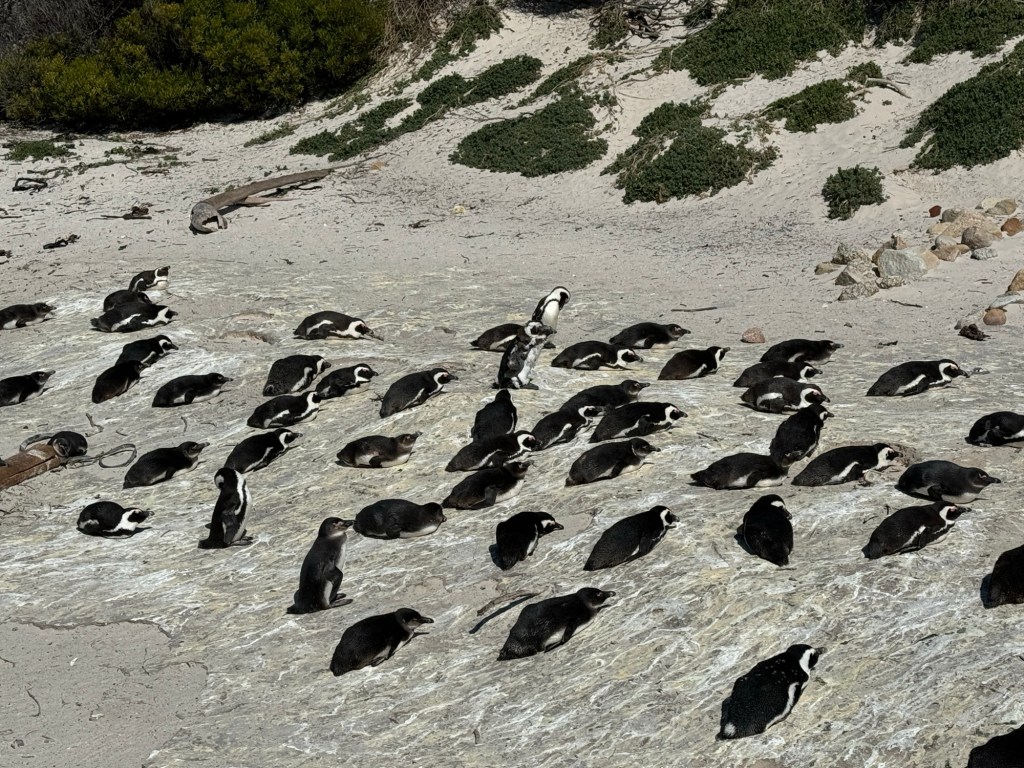 We then hopped in the bus and headed towards the Southern Cape with a stop at Simonstown where the African Penguins live. They are very beautiful and there is a little area where you can walk over boardwalks and if you are lucky see the penguins. Johannes said that because of the weather and that it was breading season there were quite a few penguins on the beach while we were there.