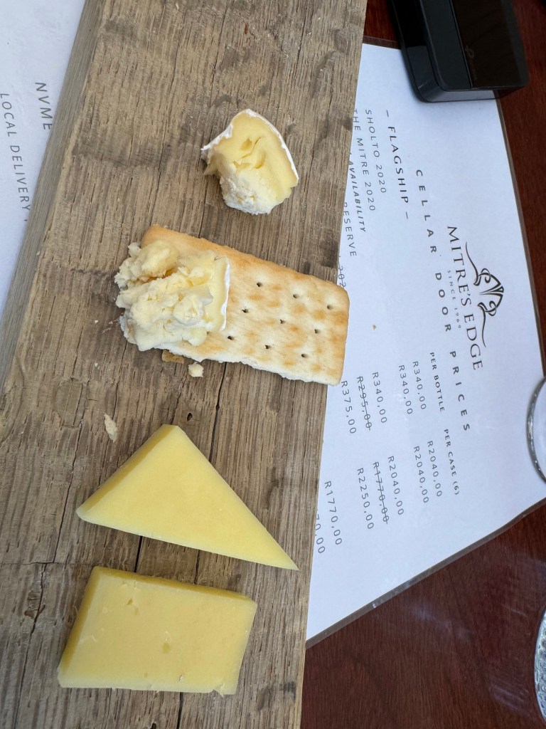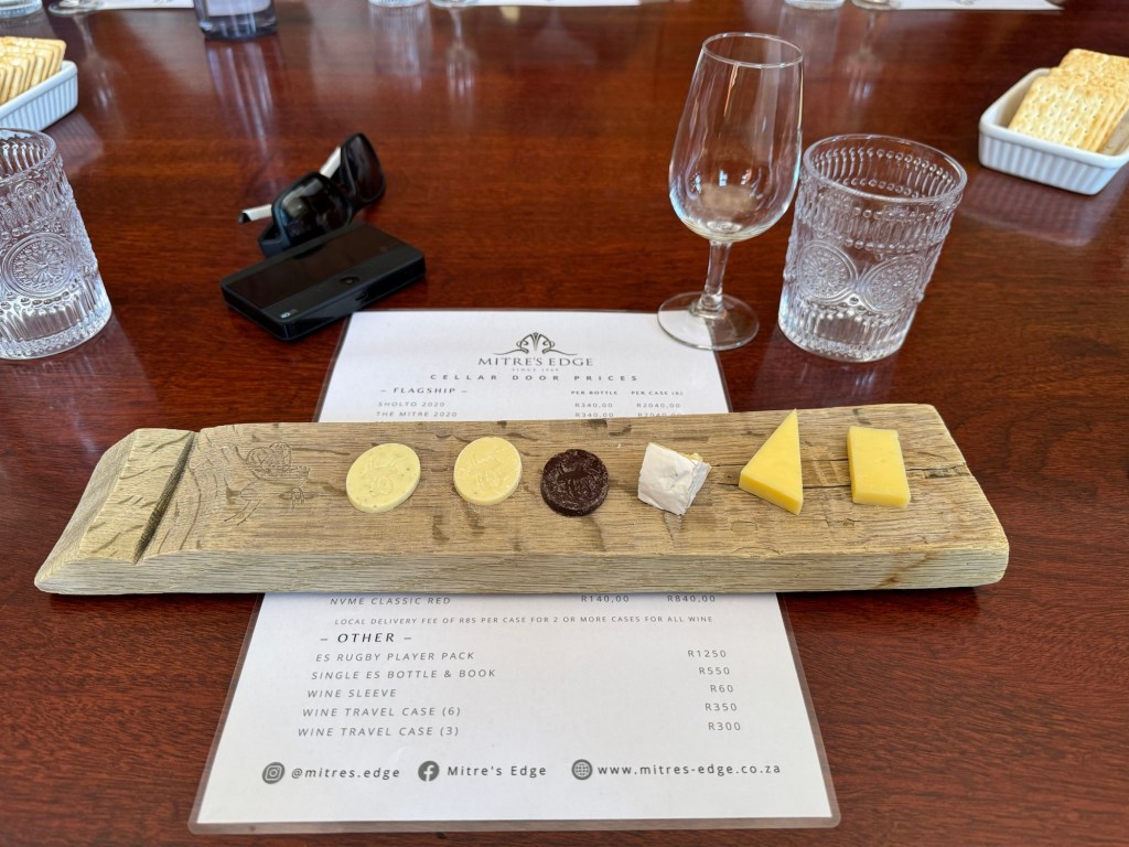 We then moved on to Mitres Edge, where they produce predominantly red wines. The vintner had put out a paring plate for us to try the wines with. The foods ranged from white chocolate blended with lemon grass and coriander to a strong cheese. I ended up buying a bottle on Cinsault which is their Pinotage and is paired with white chocolate with passion fruit and black pepper (which was delicious) their recommendation is that the Cinsault is served chilled so we will probably have this on the first night we are on safari.