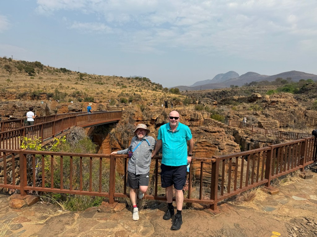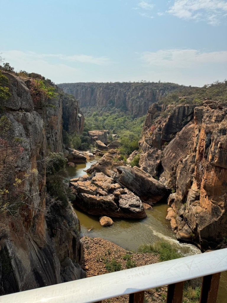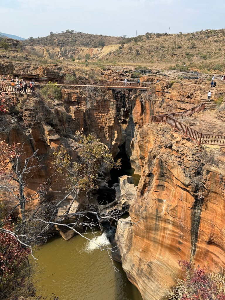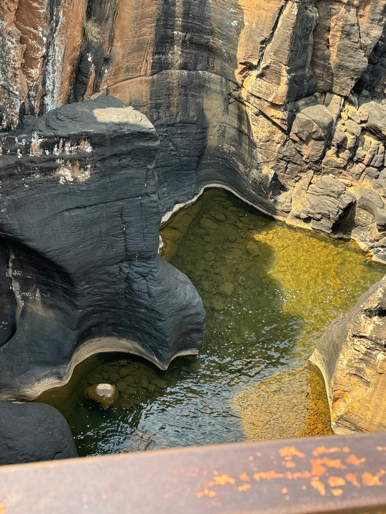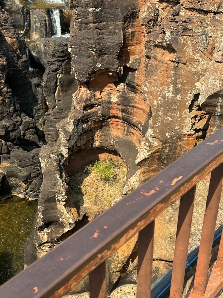 On the way we stopped at the third scenic viewing point we’d missed on the way to Kruger. They are called the Potholes. They are holes in the rock along the Blyde River. You walk down to them from the car park and then across three bridges to look at the potholes. Luckily for me they aren’t swinging bridges (suspension) so I managed to go across them even though they were a little bouncy.