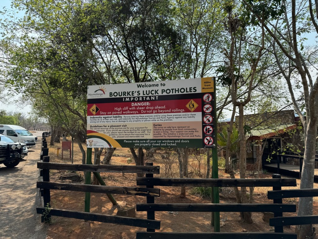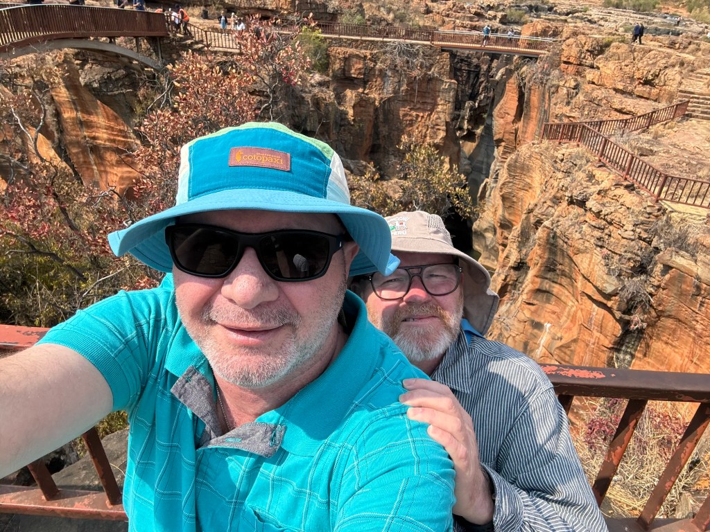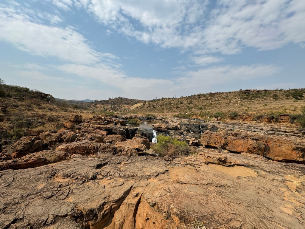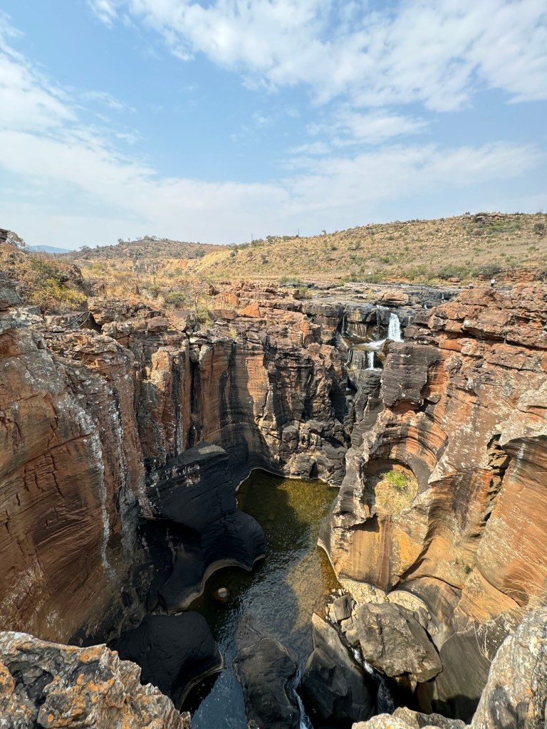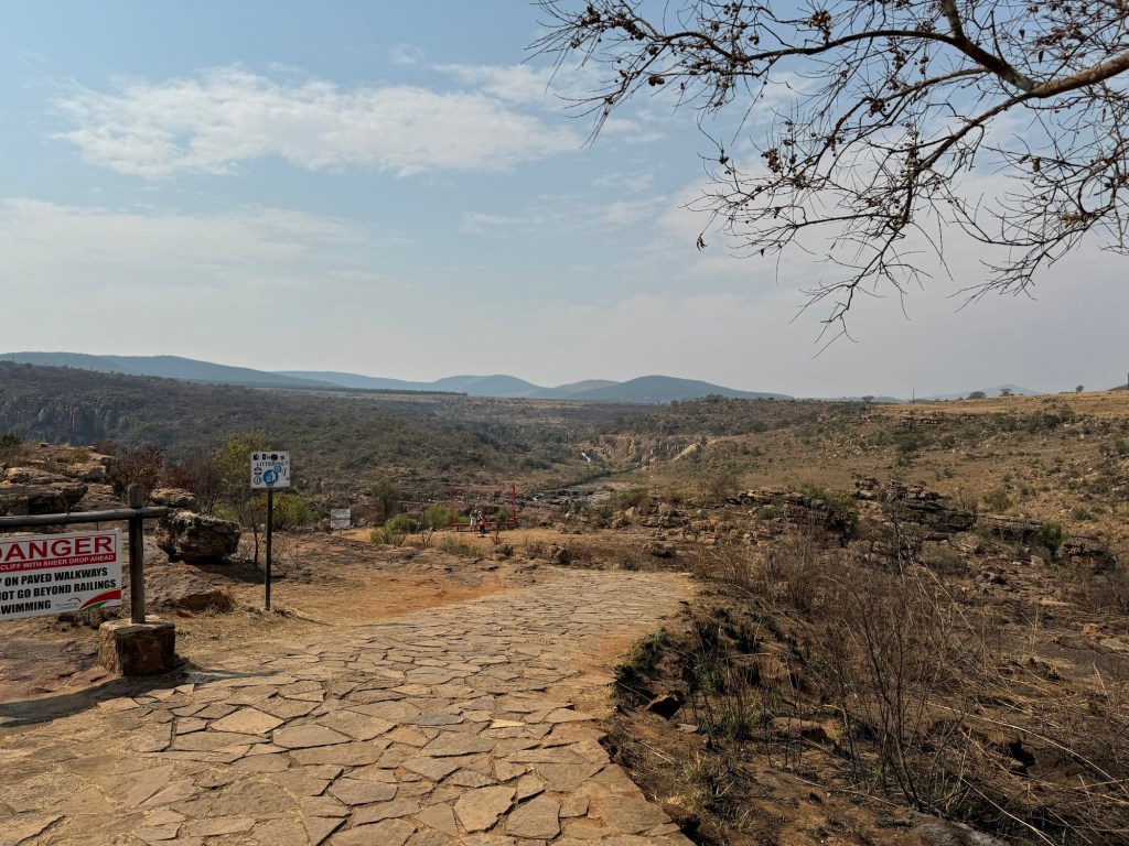 On the way we stopped at the third scenic viewing point we’d missed on the way to Kruger. They are called the Potholes. They are holes in the rock along the Blyde River. You walk down to them from the car park and then across three bridges to look at the potholes. Luckily for me they aren’t swinging bridges (suspension) so I managed to go across them even though they were a little bouncy.