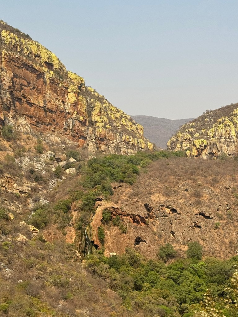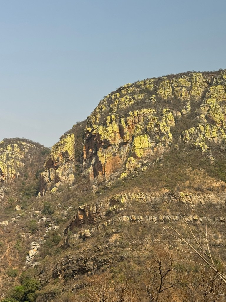 After we walked down to the Potholes we had a quick shop then on to the bus to Becks Safari Lodge in Karongwe. As we headed back down to the lowveld and the Greater Kruger Area we noticed that the cliff along the road were green. Johannes explained that this was from lichen.