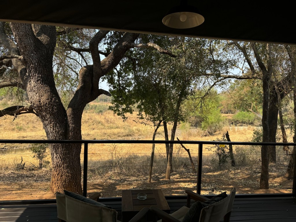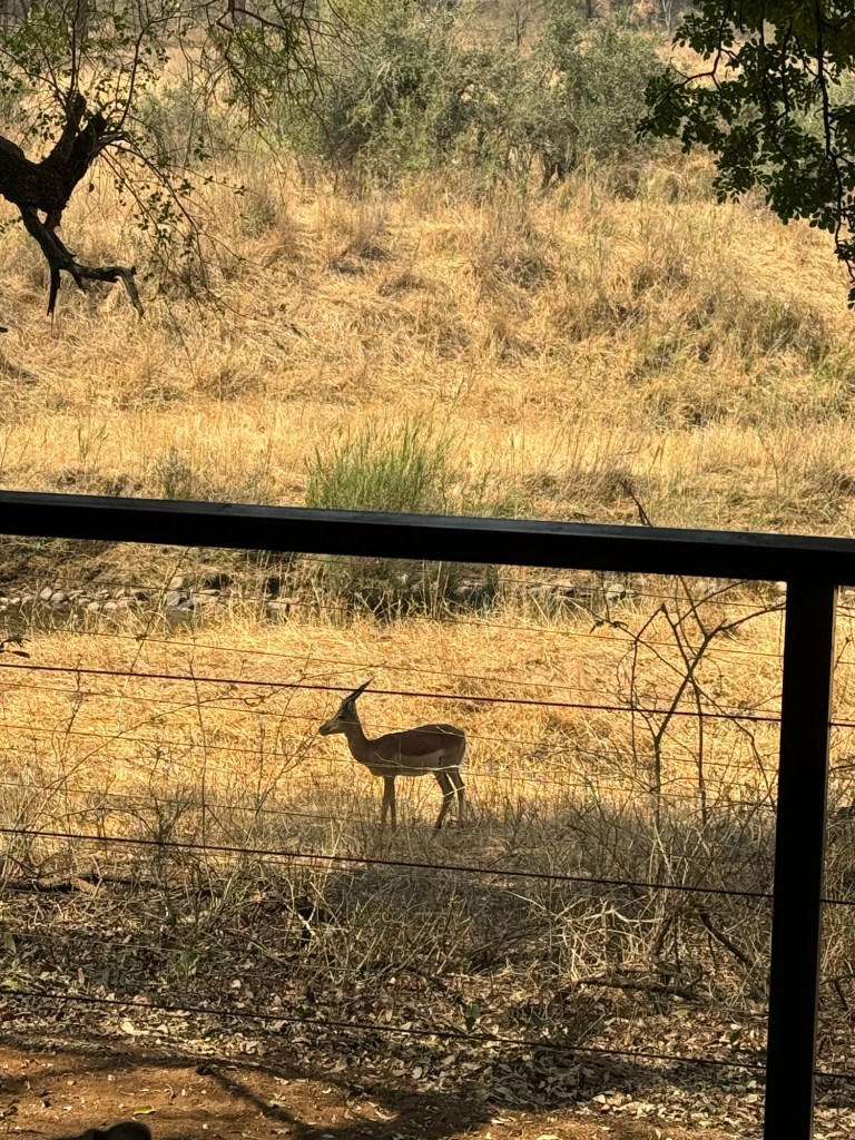 Our rooms are beautiful we have a balcony that looks out over a river bed and Impalas, Zebra and Giraffes have come down to drink so far. Once it gets dark you have to have a guard walk you to and from your room in case there are big cats around. A couple of nights ago there was a Leopard in the compound and tonight there was a J“ackal (yes not a cat but predator none the less) and a Serval.