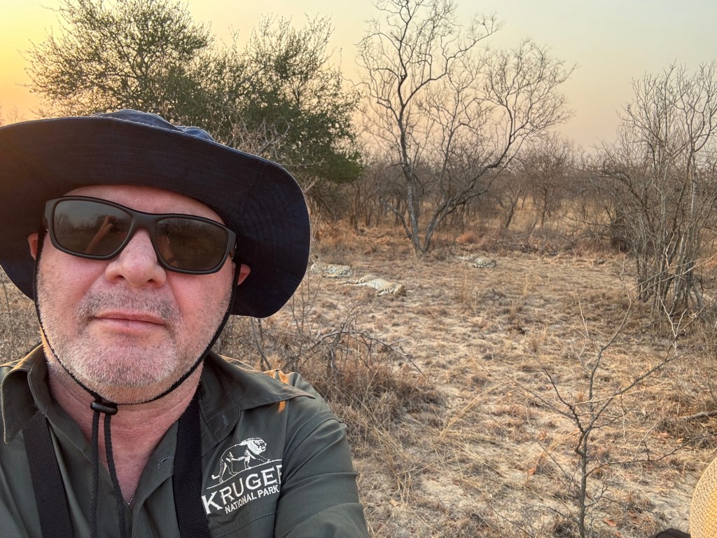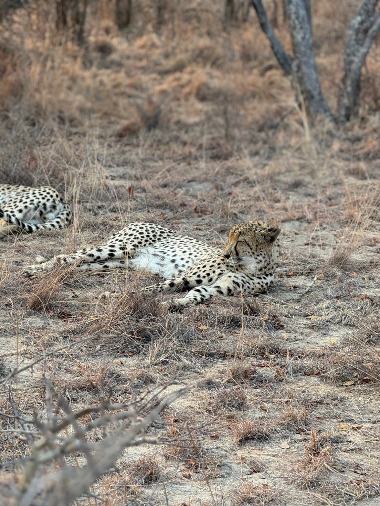 We drove around the area the lodge is in and we didn’t see much (we encountered some wildebeest and some buffalo) but then the driver said he was driving fast so he could show us something. When we came to a stop the tracker jumped off the seat in the front of the jeep and walked off into the bush. He waved us all over and we got out and walked over to where he was. They had managed to find the three male Cheetahs (they are brothers) and we could virtually walk up to them. Unlike the lion and the leopard they aren’t aggressive to humans and seemed very relaxed with about 20 people milling around them.