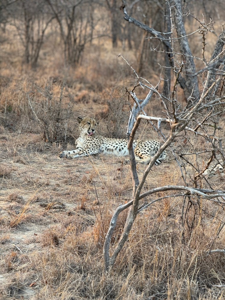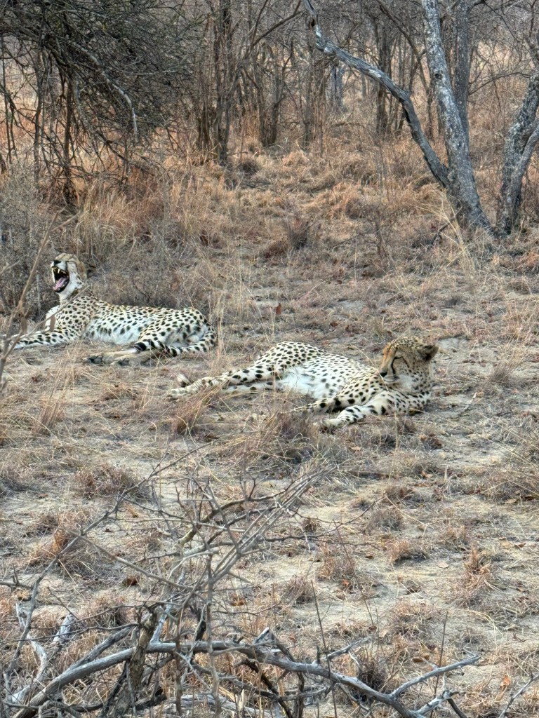 After we settled in and had lunch (ostrich steak) we had a talk from a Cheetah conservationist who explained there are 5 Cheetah’s here at Karongwe, 2 females and 3 males. Once the 3 males have bred with the females and teh cubs have been born they may either move the cubs (once they are weened) or the males to avoid inbreeding.