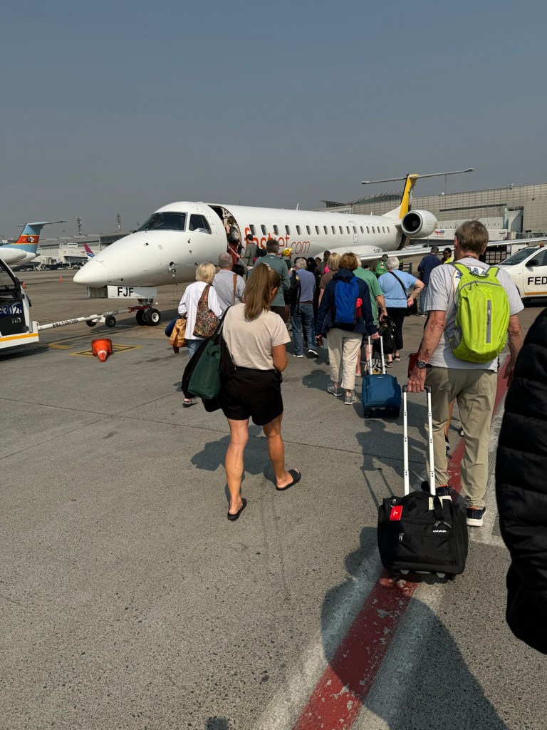 We got to the airport about 7:30 as the traffic wasn’t as bad as Johannes had thought it was going to be. Check in was pretty smooth as was going through security and immigration. We are now on the very small Embraer 145 (rows are made up of three seats in a 1/2 configuration. We have just had our inflight snack a chicken mayo sandwich and a box with a chocolate, juice and little protein chips. I am watching Professor Brian Cox’s Planets (which I have downloaded onto my iPad) while I am typing this trying to get ahead of my blog today.