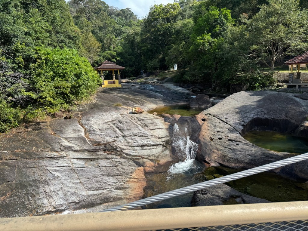 We started at the entrance and walked up to station 4 where there is a bridge and a drop down to station 3 the Telaga Tujuh waterfall.