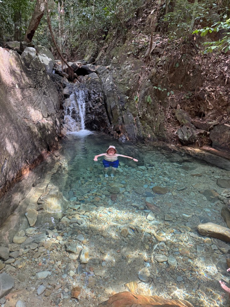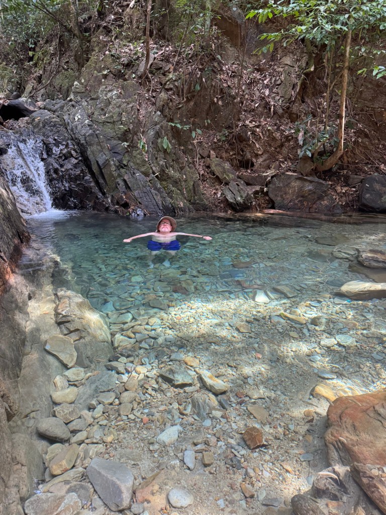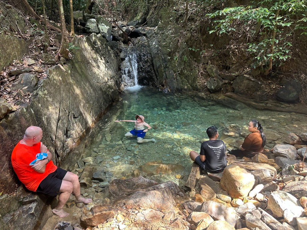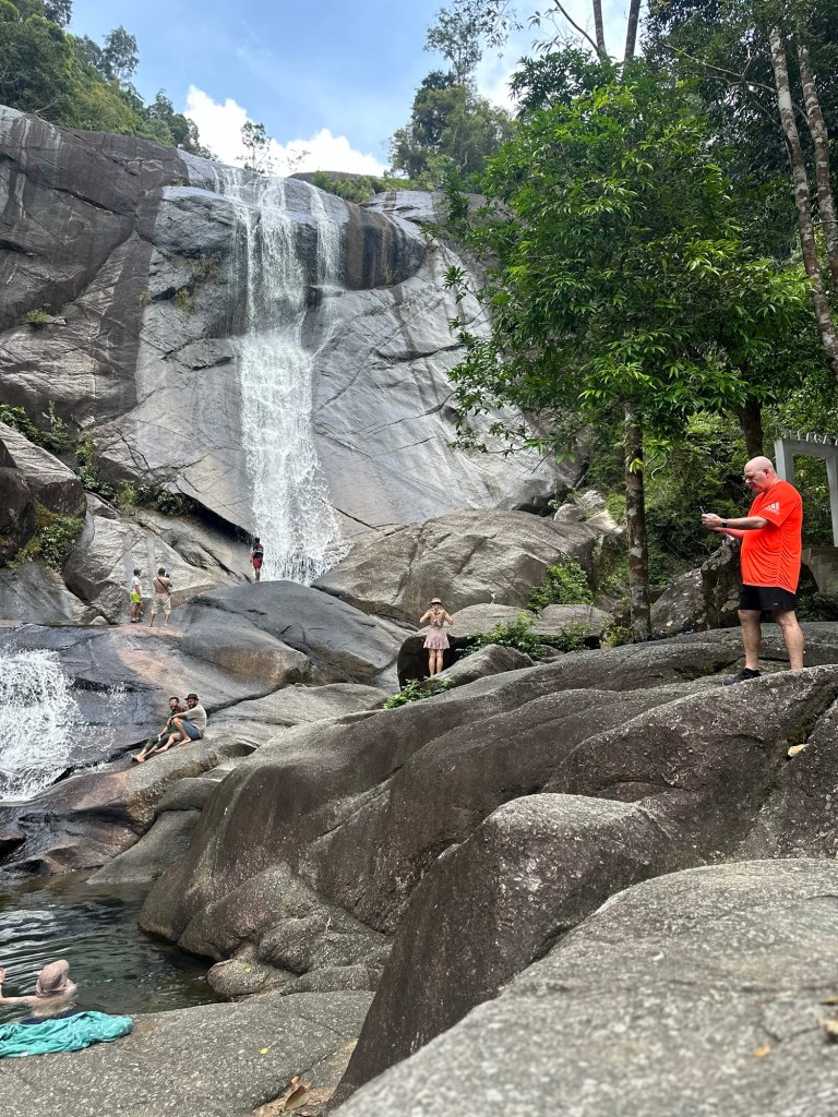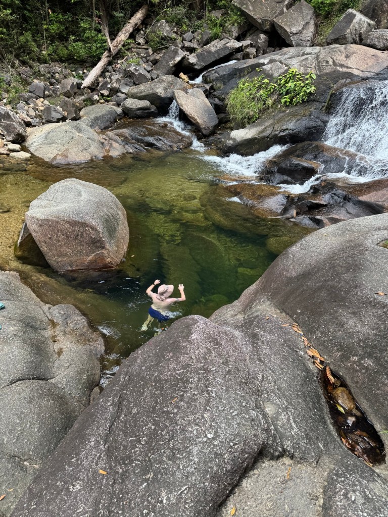 We walked back down the way we came and went over to stop 3 the Telaga Tujuh waterfall where there were a few people there (most had headed up the mountain) and Stu had another swim. It is very deep so Stu got to have a good swim and cool down. I again paddled (way too cold for me).