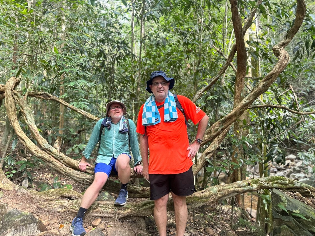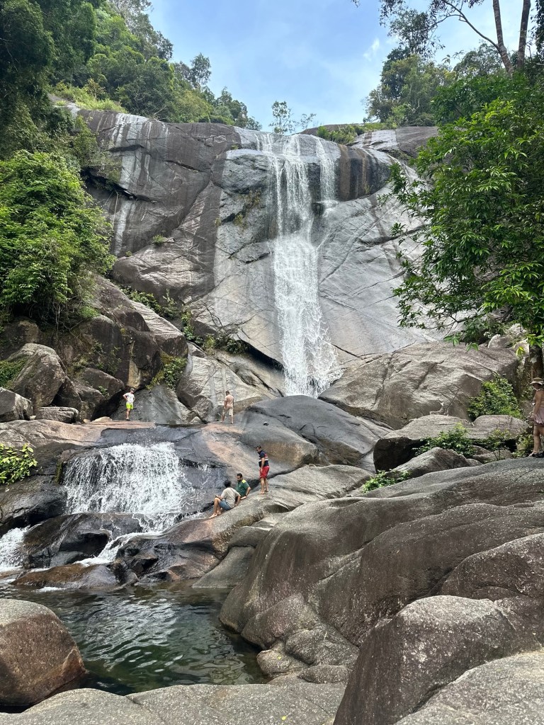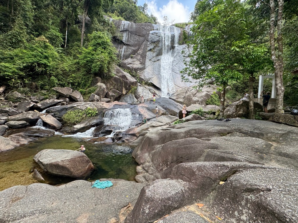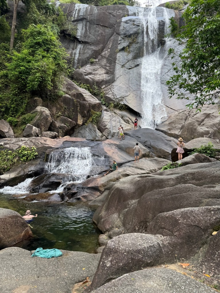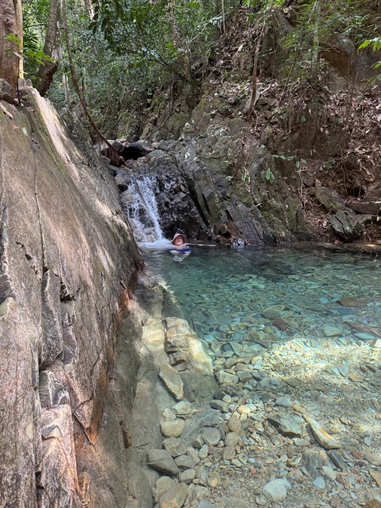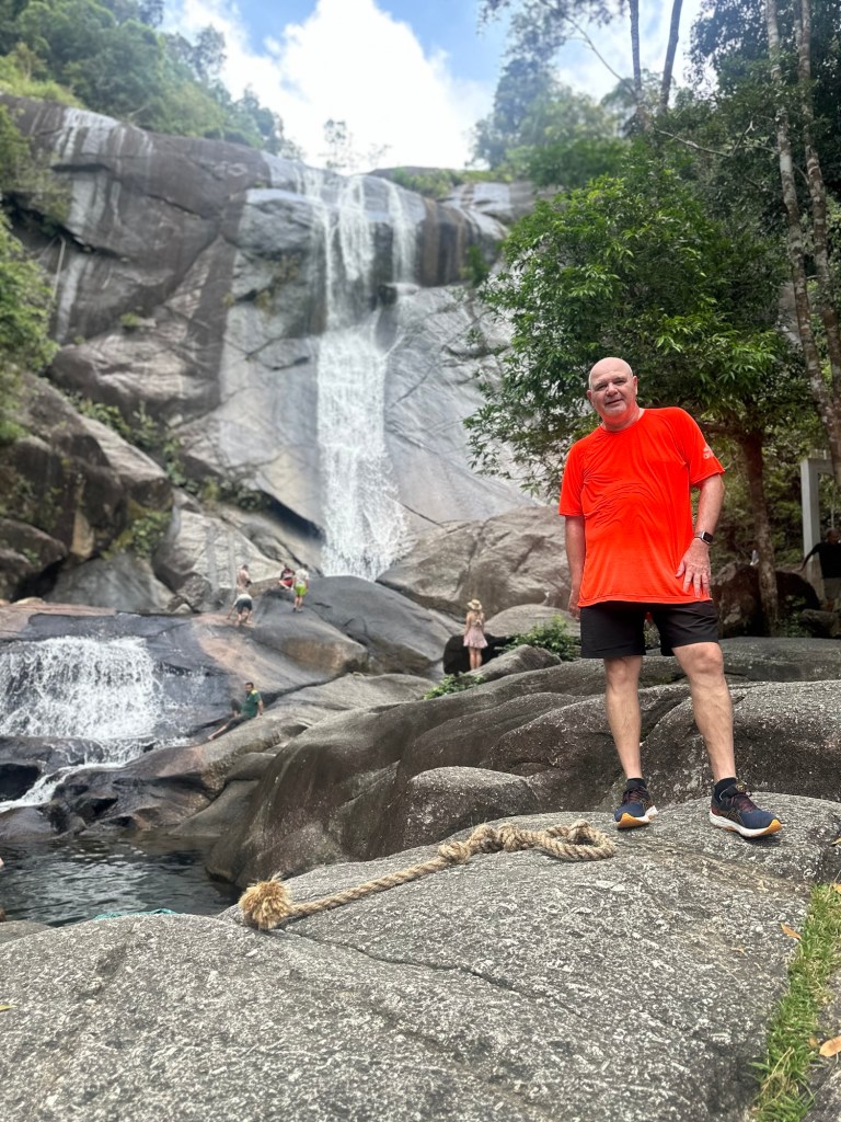 We walked back down the way we came and went over to stop 3 the Telaga Tujuh waterfall where there were a few people there (most had headed up the mountain) and Stu had another swim. It is very deep so Stu got to have a good swim and cool down. I again paddled (way too cold for me).