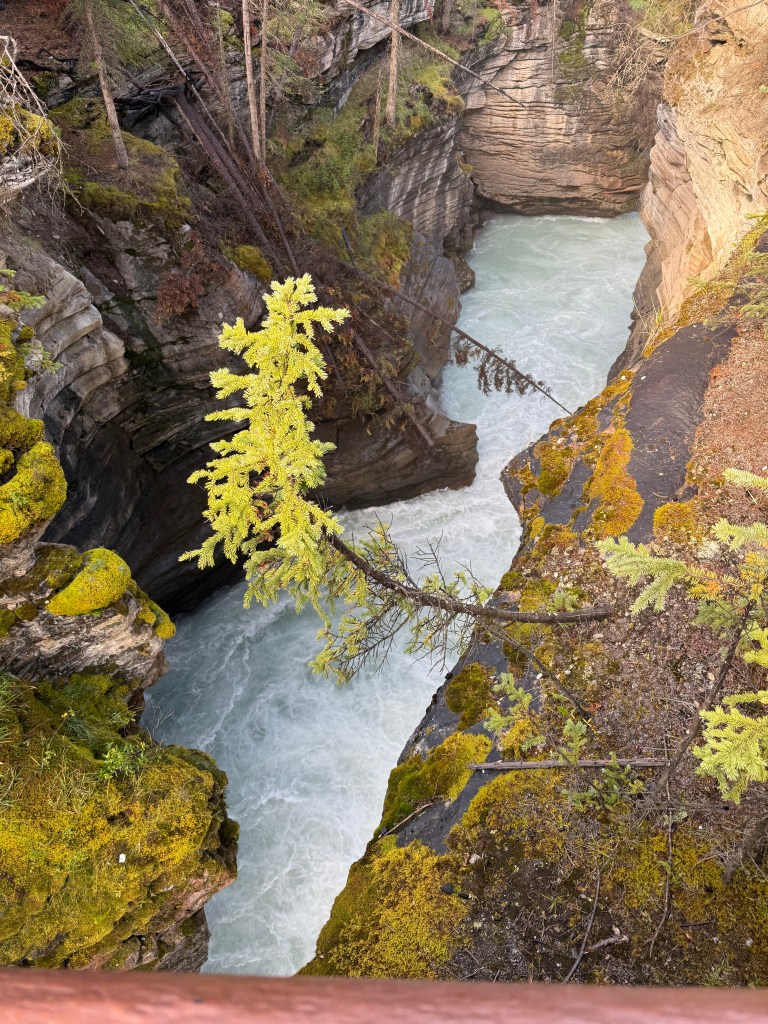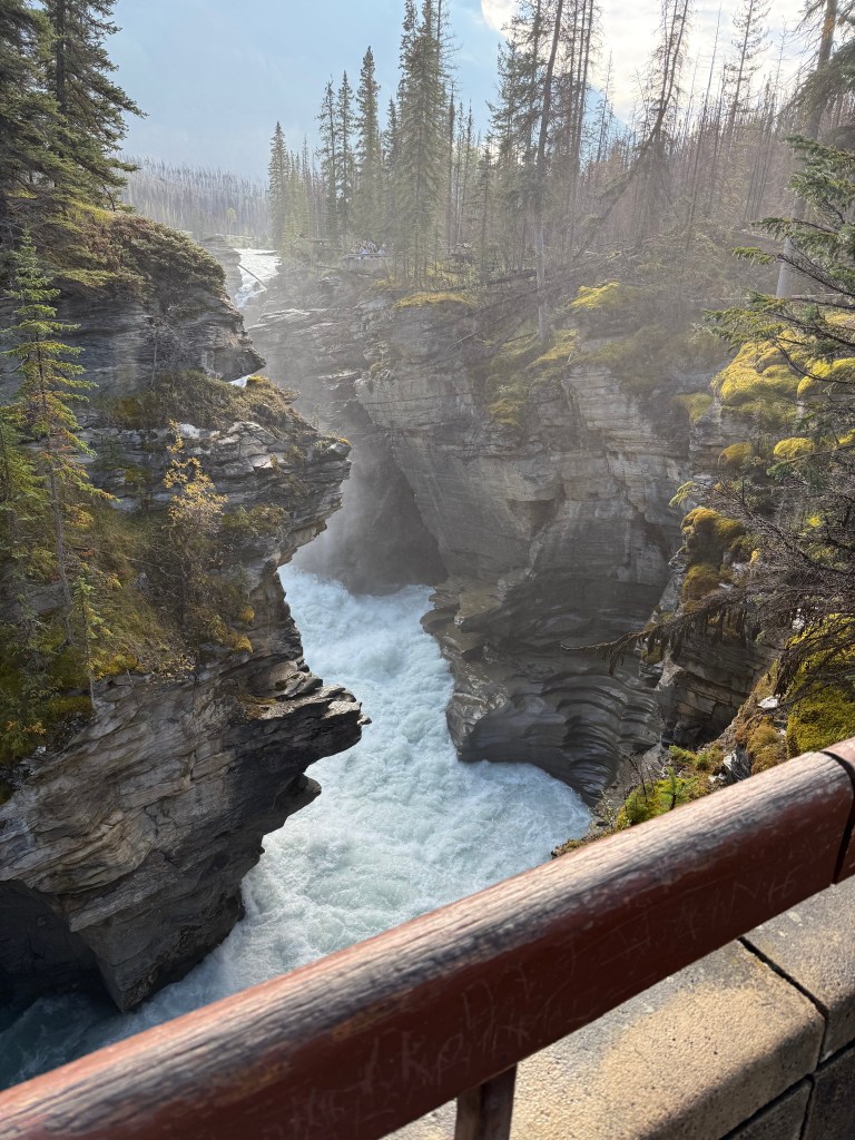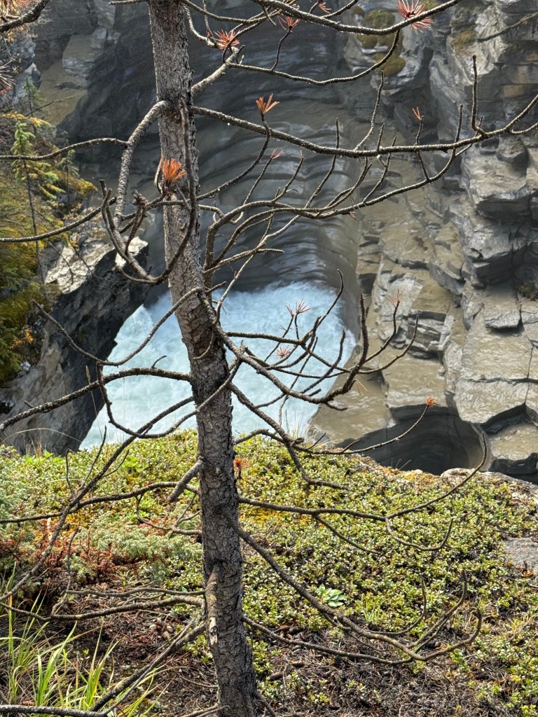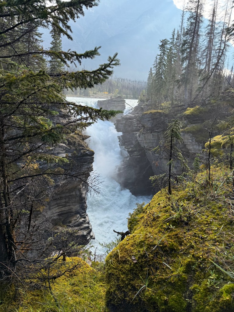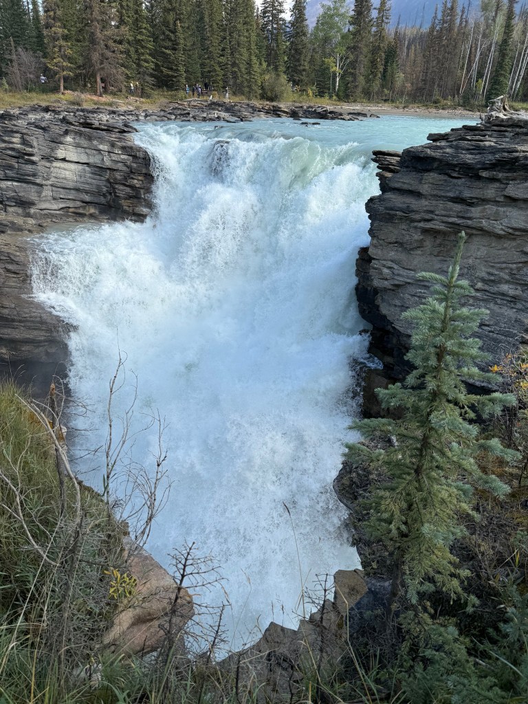 After breakfast we decided to head to the Athabasca Falls which are about 30km from here down the Icefields Parkway. The falls are beautiful and you can imagine little critters crossing the very swift river getting caught in the current and washing down through the falls. There is a sign that says that various animals wait where the water comes out of the canyon to get anything that has perished in the falls – an easy meal. There are lots of walkways and platforms so you can view the falls and potholes from various angles.