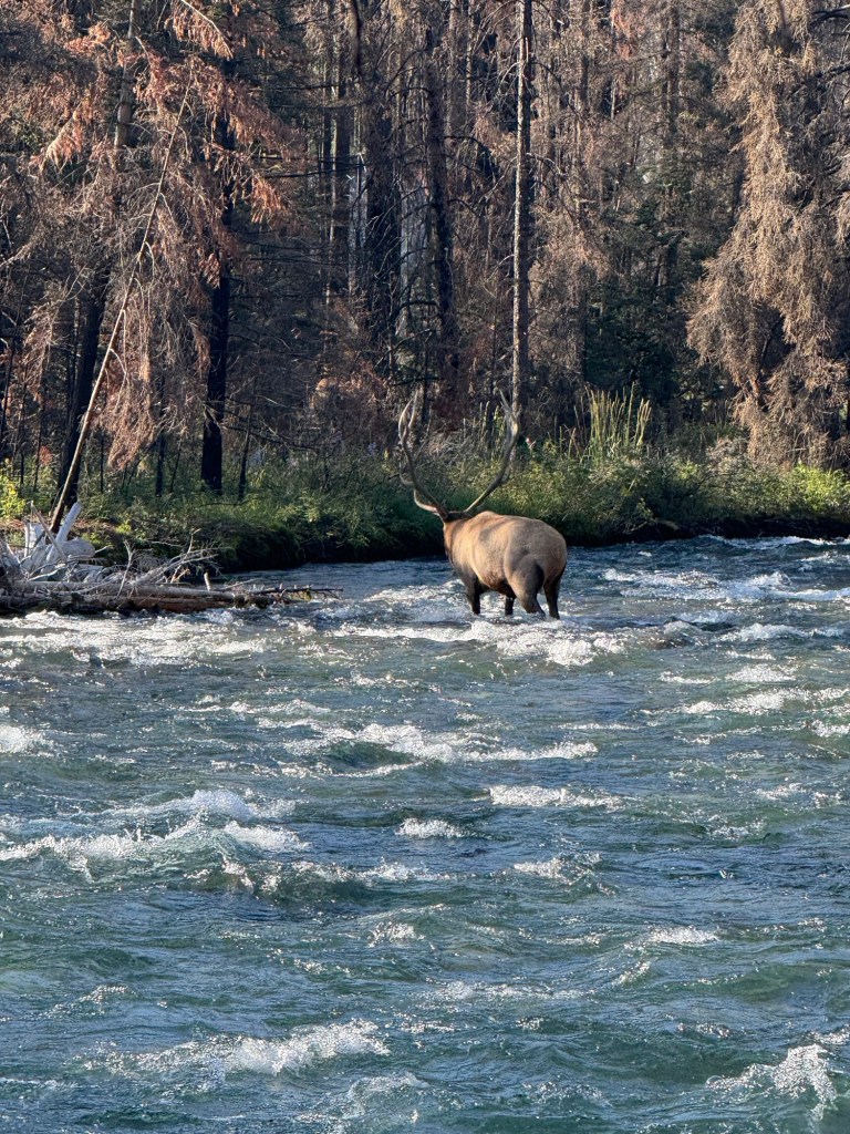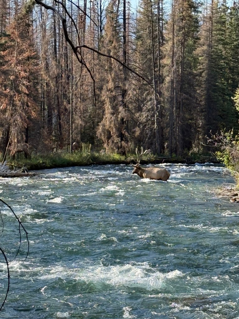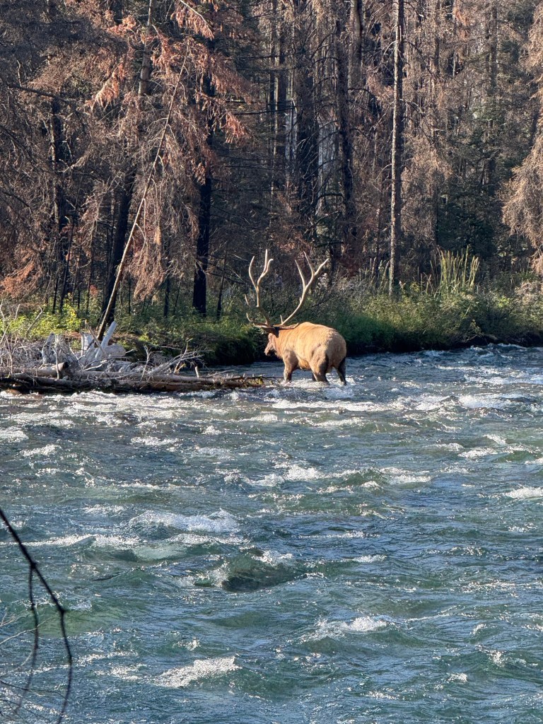 We saw a big male elk with his harem crossing the river which was amazing to watch and Sam told us how aggressive they were. We then headed to the Beaver pond and saw a beaver swimming around, however we were looking into the sun and couldn’t really see much. After a quick loo break we were off looking for bears, however they were very elusive, and we didn’t spot any. Sam then dropped those off that had dinner plans and we were up the Maligne valley looking for Moose.