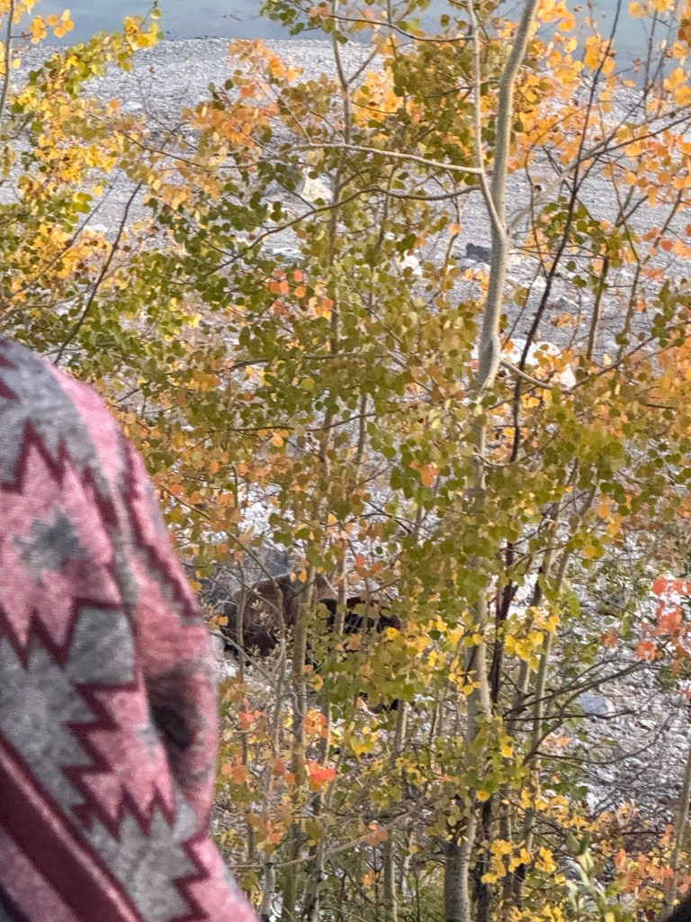 As we drove up the valley, we saw a whole lot of cars parked on the side of the road and all the tourists out of their cars (idiots). Sam pulled over and we looked out the windows and we got a glimpse of a grizzly bear and her two cubs, the black one in the photo is the older male cub who is about 2 or 3. The grizzly is known as 222 and can be a bit of a problem, and one of her cubs is on a watch list (the male) as a tourist hand fed it to get better photos, and now it comes up to cars begging food. There are signs everywhere saying “A Fed Bear is a Dead Bear”. Bears that habitually come to get food from people end up having to get euthanised as they will eventually attack people to get food or if they don’t give them food. You have to look closely to spot the bear.